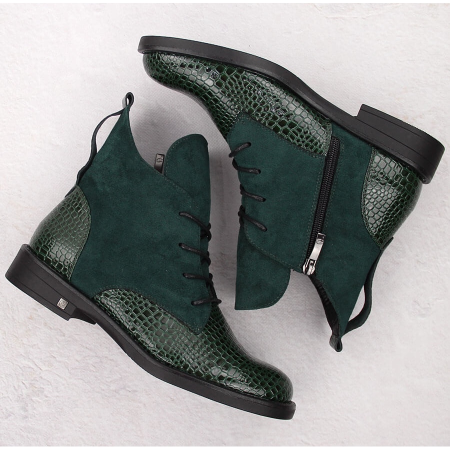 Les bottines Potocki de couleur verte s'inscrivent dans les dernières tendances et le motif aux tons animaliers les rend originales. L'utilisation de cuir écologique verni les rend extrêmement impressionnants. Ces bottines sont le choix parfait pour la saison automne et hiver, aussi bien pour un style de tous les jours que pour un style plus élégant.