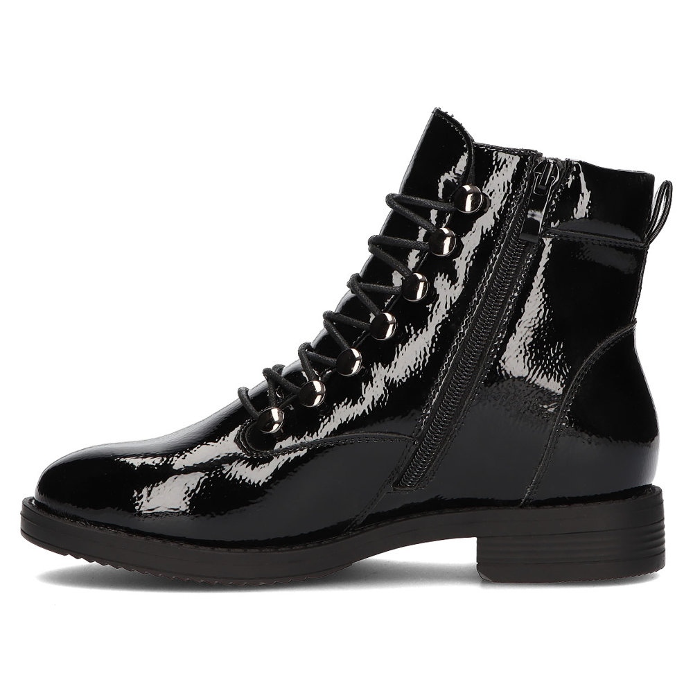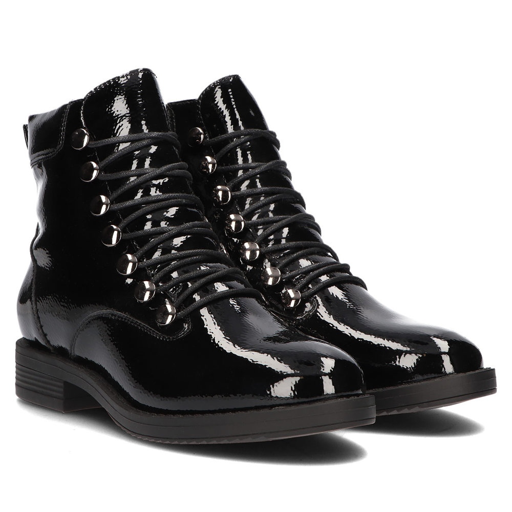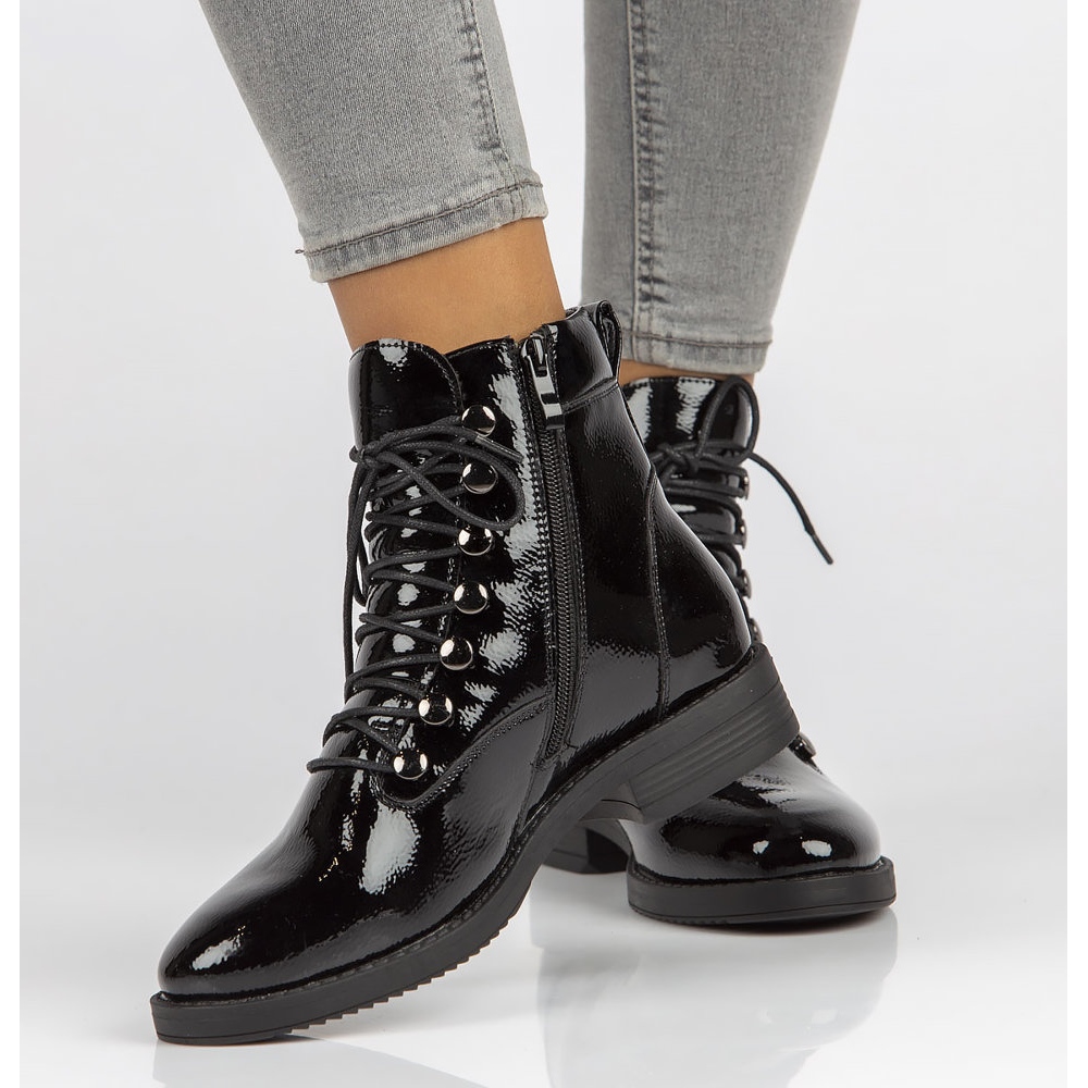 Les détails de la fermeture éclair et des lacets sont des éléments pratiques qui vous permettent d'adapter facilement les bottes à vos besoins. La finition laquée leur confère un style élégant, et la couleur noire intemporelle convient aussi bien aux styles décontractés que plus formels.