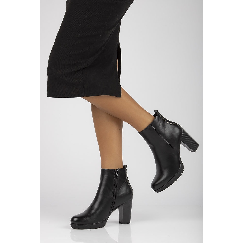 Fabriquées en cuir écologique de haute qualité, les bottines offrent non seulement de l'esthétique, mais aussi de la durabilité. Le nez en amande ajoute de la subtilité, et les strass et clous ajoutent du caractère, ce qui en fait un complément parfait à n'importe quel style. La tige haute d'une circonférence de 28 cm et d'une hauteur de 10 cm assure stabilité et confort de port, et l'isolation vous gardera au chaud même les jours les plus froids.