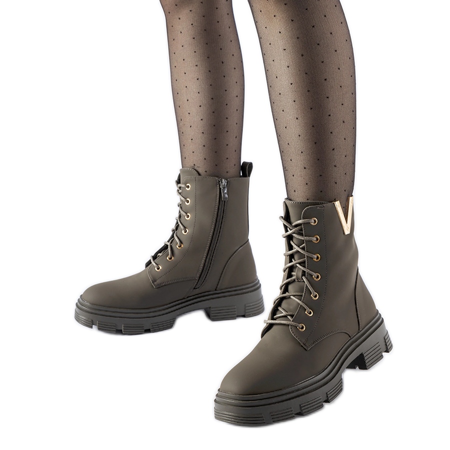 Les bottines vertes foncées et mates isolées sont des chaussures pour femmes qui allient élégance et fonctionnalité. Fabriquées en cuir écologique, avec une semelle en caoutchouc de la même couleur. Le bout rond des chaussures permet une libre circulation des orteils, et les bottes sont également lacées, ce qui permet un ajustement parfait. L'isolation à l'intérieur de la chaussure en fait une excellente protection contre les basses températures. Ces modèles ont des talons bas et plats d'une hauteur de 4,5 cm, ce qui garantit un confort de port tout au long de la journée. La hauteur des chaussures est de 21 cm, ce qui signifie qu'elles arrivent au-dessus de la cheville. Les bottes n'ont pas de motif dominant, elles se ferment à l'aide d'une fermeture éclair et d'un laçage. Le produit est disponible dans l'emballage d'origine du fabricant - une boîte. Le fabricant code ce modèle sous le nom SP216 et définit sa couleur comme Kaki.