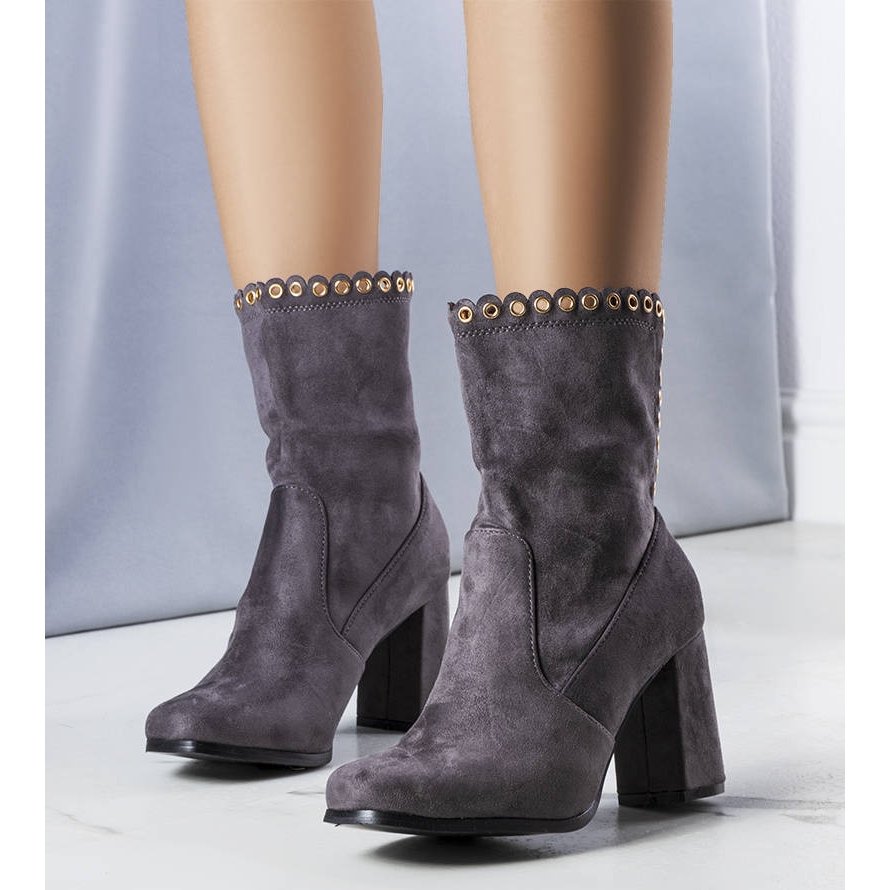 Bottes grises sur le poste Ellianna - Élégance et confort pour les jours plus frais. Un nez rond classique combiné avec un talon solide comme un poteau (8 cm) optiquement mince la silhouette, et la partie supérieure atteignant la cheville (environ 24 cm) s'harmonise parfaitement avec un manteau, une jupe ou un jean. Fini avec des strass subtiles qui ajoutent du caractère à toute stylisation.