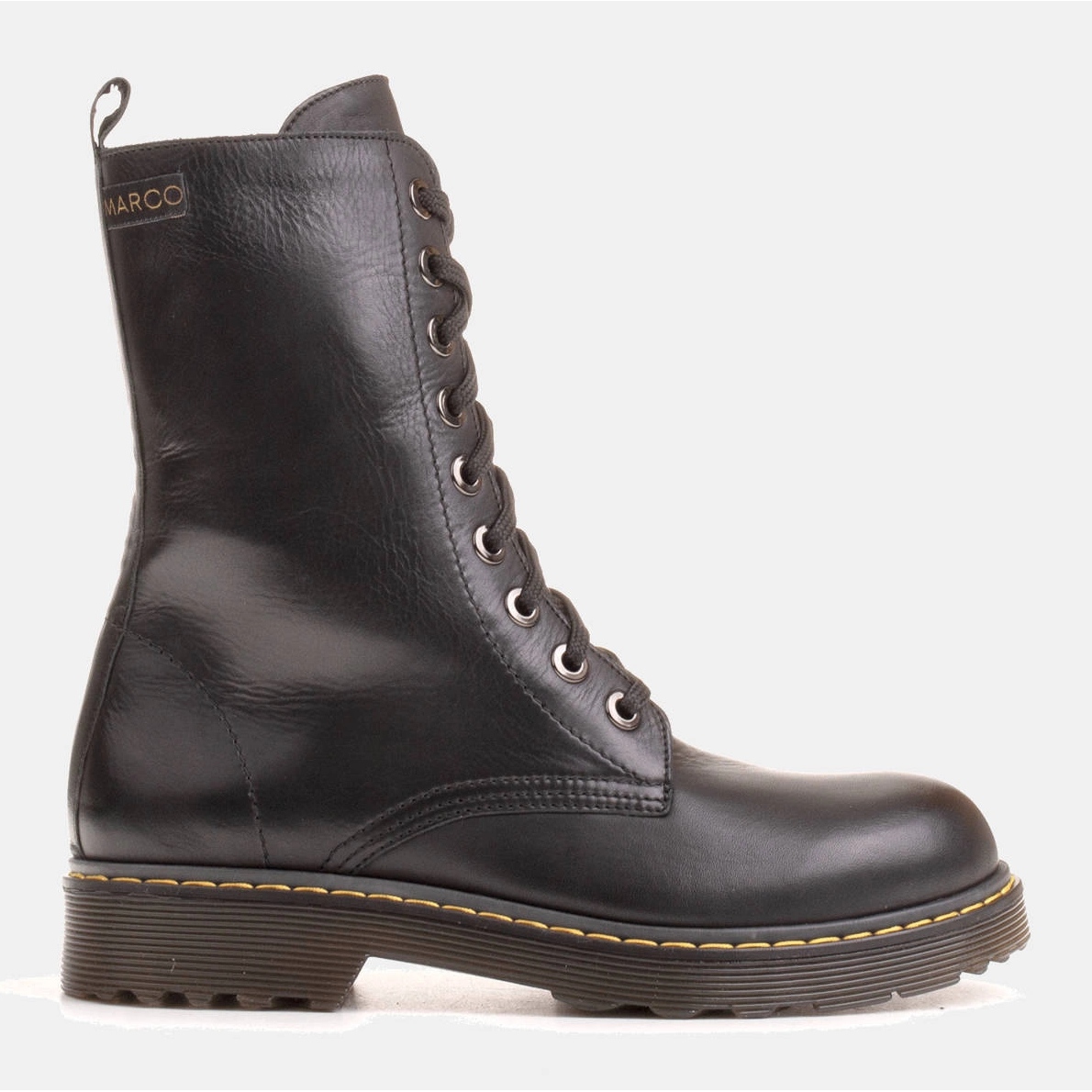 Des bottes de chaussures Marco élégantes et isolées conçues pour les femmes qui apprécient une combinaison d'un personnage rock classique avec réconfort chaque jour. Cuir naturel à grains noirs, une fermeture à fermeture éclair et de laçage pratique et une semelle semi-transparente forment un modèle universel à la mode pour des mois plus frais.