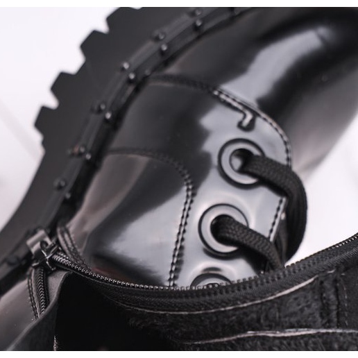Isolés avec un couvre-chaussures, ils sont parfaits pour les journées froides et gardent vos pieds au chaud. Une semelle massive avec des rivets noirs tout autour et une tige haute leur confèrent un style rock caractéristique qui s'intègre parfaitement dans les tendances glam rock et grunge. Grâce à la fermeture éclair cousue sur le côté, l'enfilage est très facile, et l'ensemble comprend également des lacets noirs et rouges, ce qui permet une variété de styles.