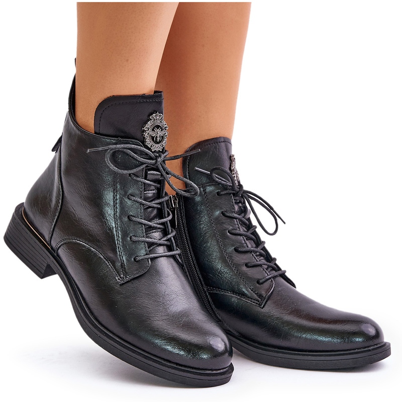 Les bottes plates isolées avec décoration, noires, sont la combinaison parfaite de style et de confort qui rendra vos journées les plus froides plus agréables. Fabriquées en éco-cuir de haute qualité, ces bottines se distinguent par leur design élégant et leurs détails fonctionnels. Le talon plat de 3 cm de haut garantit un confort de port et la tige jusqu'à la cheville (14,5 cm de haut) ajoute une touche tendance à n'importe quel style.