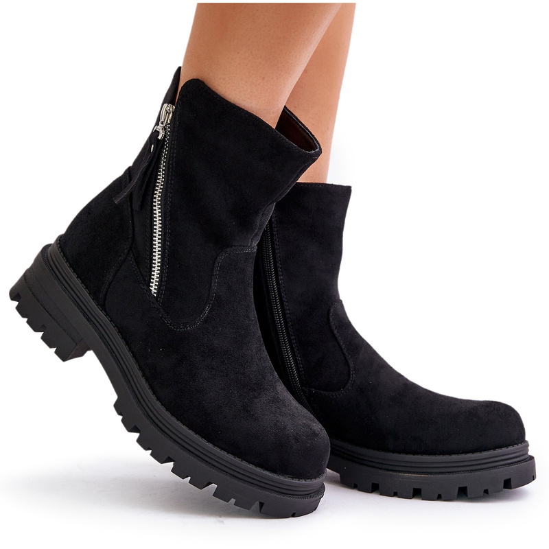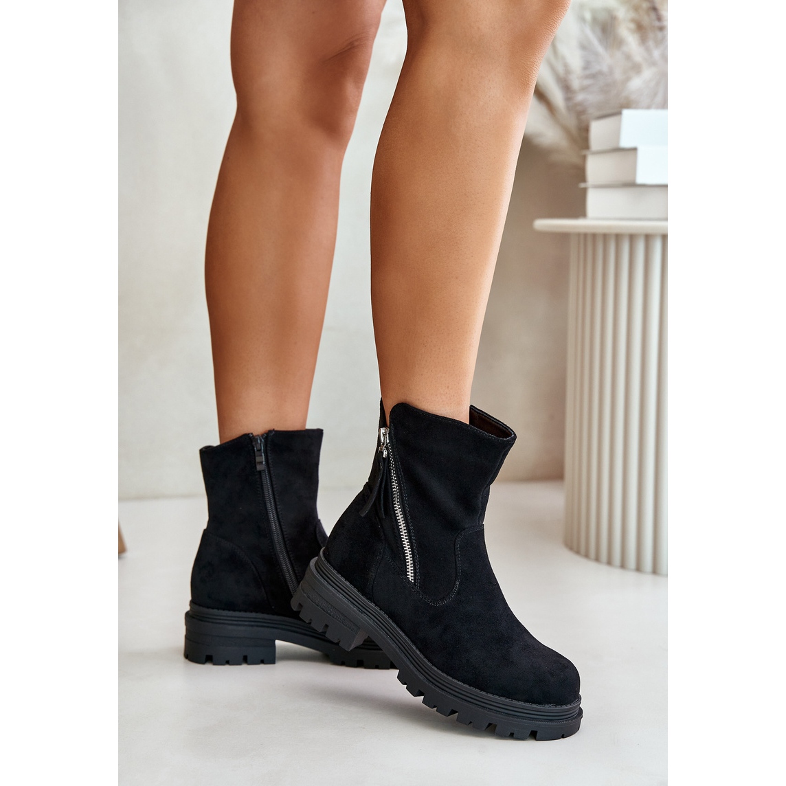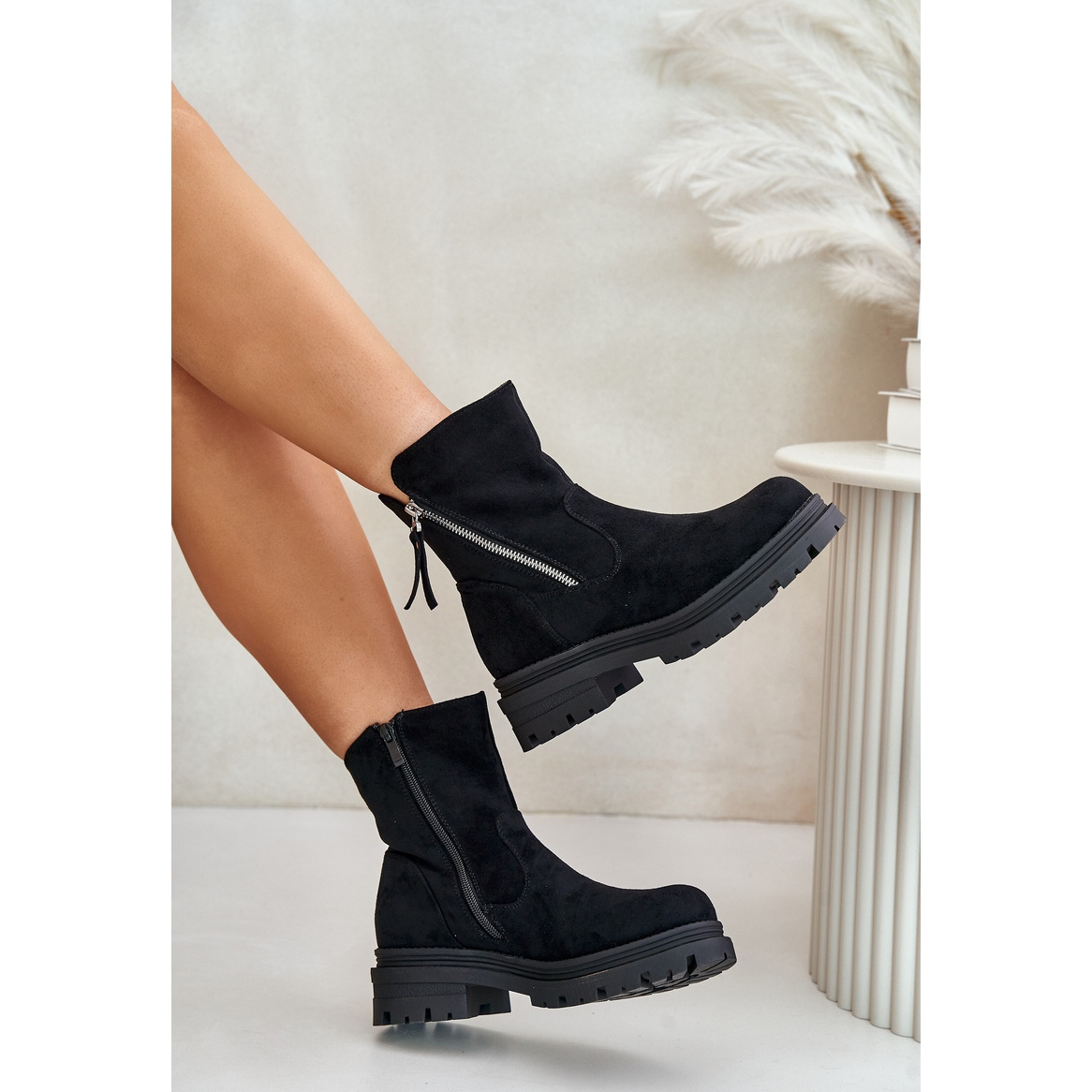 Les bottines avec fermeture éclair sont une solution qui facilite leur enfilage et leur retrait. La hauteur supérieure de 15 cm et la largeur de 12,5 cm épousent parfaitement la cheville, assurant un look tendance. Disponibles dans une couleur noire classique, ils s'adaptent à de nombreux styles, du plus décontracté au plus élégant.