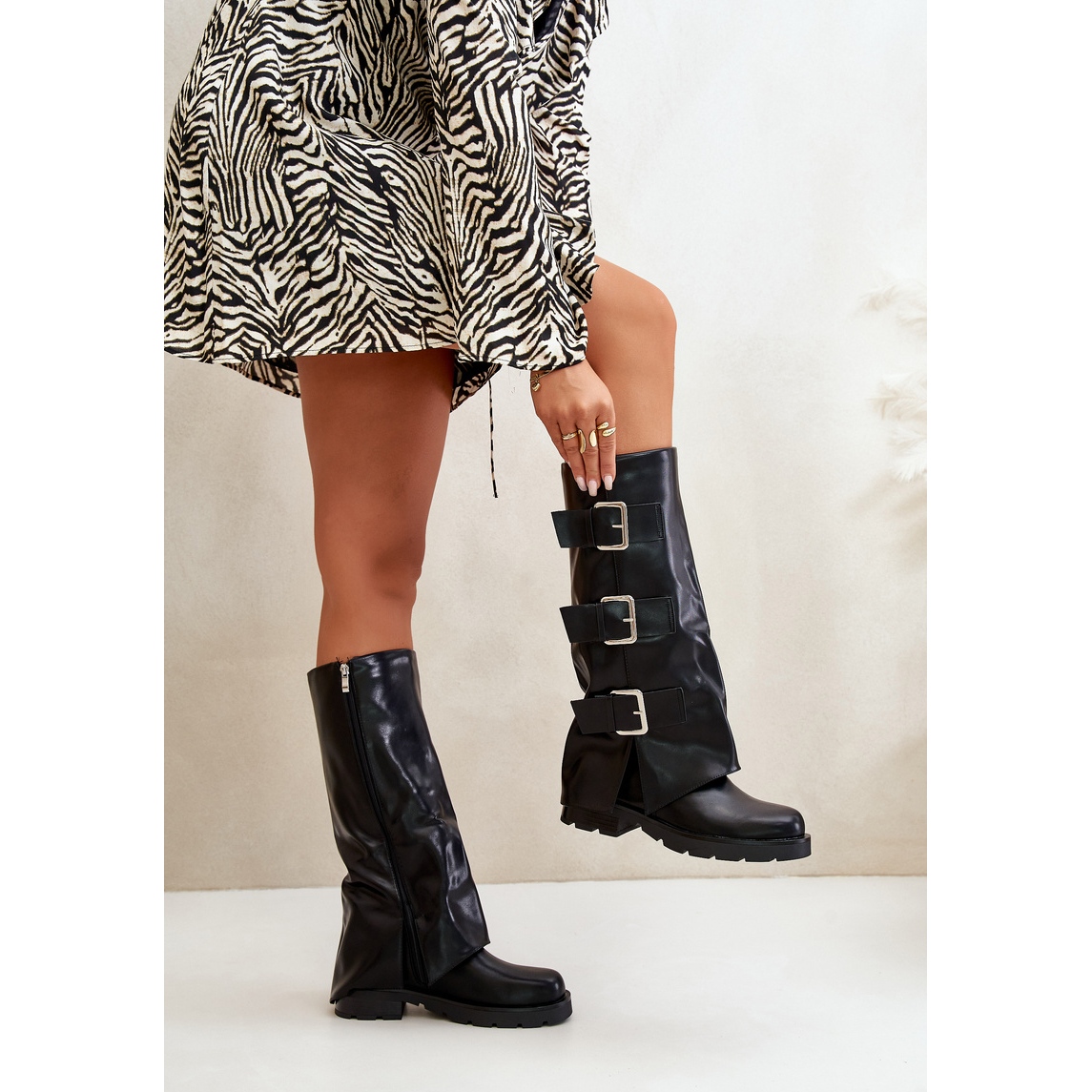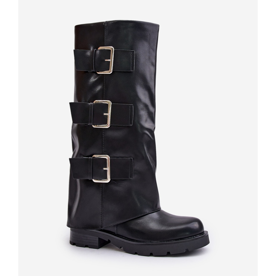 Les bottes sont montées sur un talon plat de 4,5 cm de haut, qui garantit la stabilité à chaque pas. Elles se distinguent par leur design original, grâce à la tige roulée ornée de brides accrocheuses avec de grandes boucles qui leur confèrent un caractère moderne. Le bout rond et l'isolation de la couverture des chaussures offrent confort et chaleur, même par temps froid.