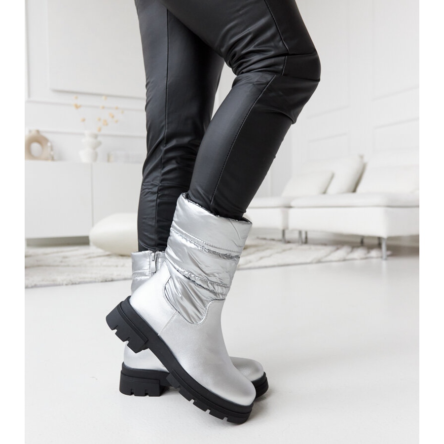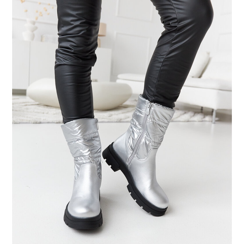 Leur bout rond offre un confort de port supplémentaire, ce qui en fait une excellente solution pour les longues promenades. Les bottes sont fabriquées en caoutchouc de haute qualité, ce qui garantit une excellente adhérence sur diverses surfaces, ce qui est crucial pendant les journées d'hiver. Ces bottines argentées deviendront certainement un accessoire élégant dans votre garde-robe d'hiver, s'adaptant parfaitement aux tenues décontractées et plus élégantes.