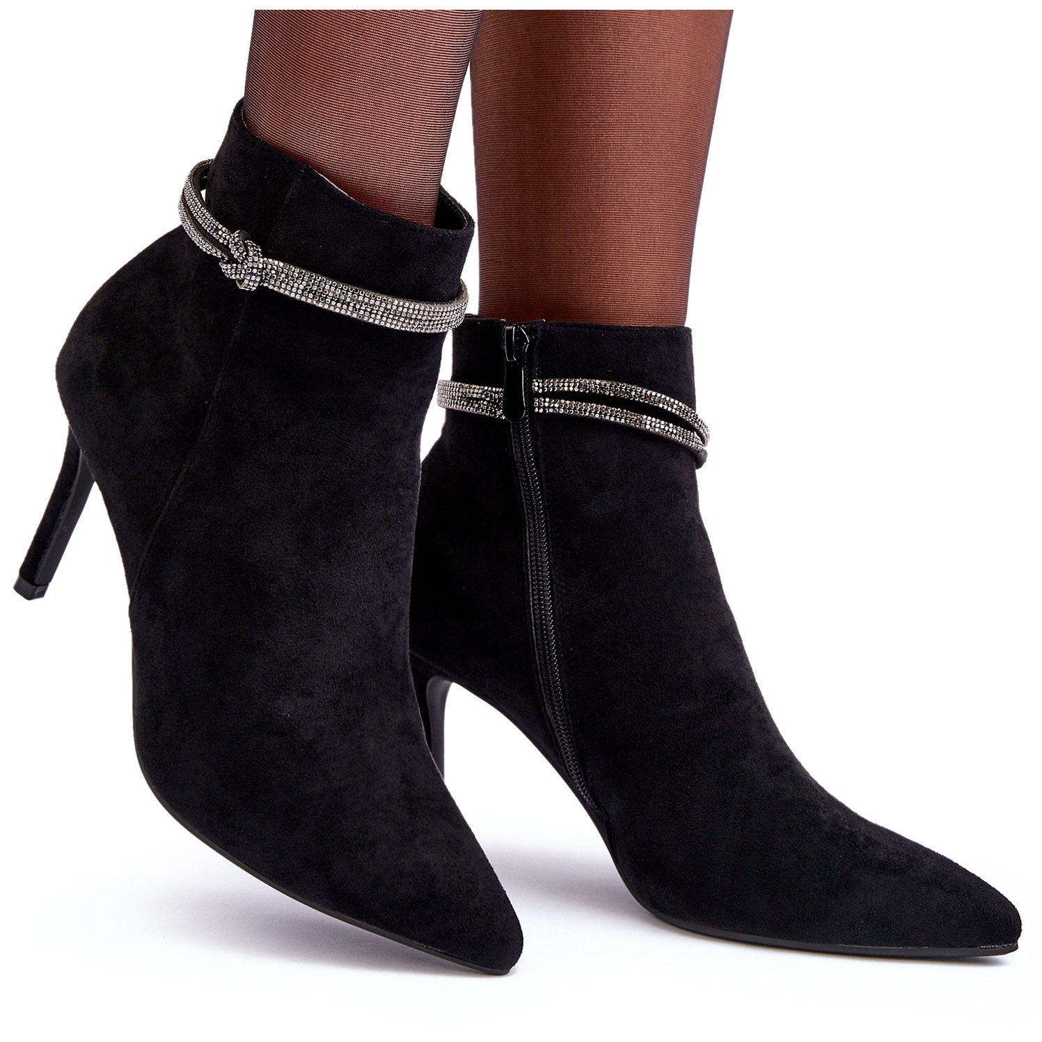 Le modèle est extrêmement impressionnant grâce aux talons aiguilles de 9 cm de haut qui allongent optiquement les jambes. La tige des bottines est enrichie de deux brides entrelacées, ornées de nombreux strass brillants, apportant une touche mode à l'ensemble. De plus, les bottes sont fermées par une fermeture éclair sur le côté, ce qui les rend plus faciles à enfiler et à enlever.