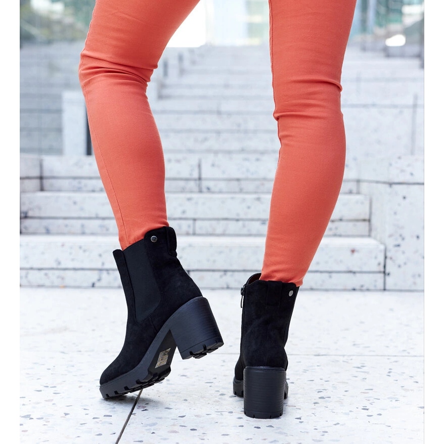 Ces bottes noires isolées pour femmes sont la solution parfaite pour les femmes qui apprécient l'élégance et le confort. Les chaussures arrivent au-dessus de la cheville, ce qui allonge stylistiquement les jambes. Ils ont un talon bloc haut qui non seulement met en valeur la forme de la silhouette féminine, mais ajoute également de la confiance en soi. Les bottes ont un bout en forme d'amande, à la fois classique et tendance.