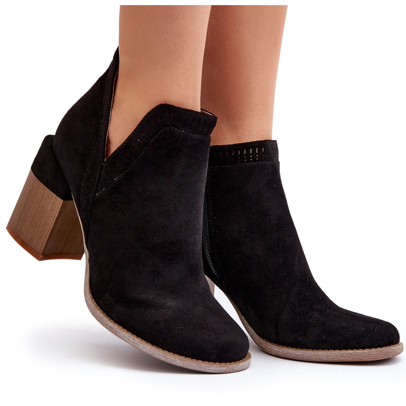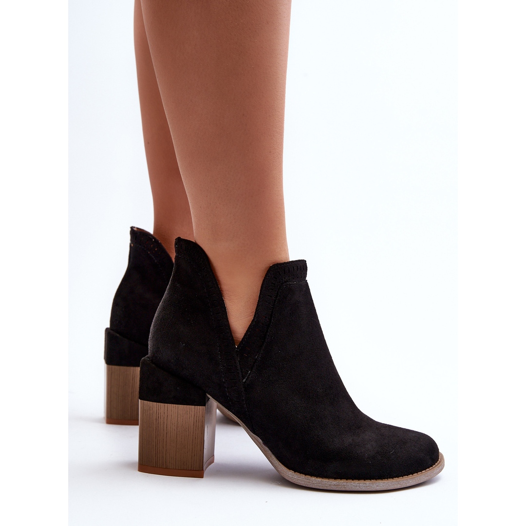 Bottines élégantes sur un talon haut massif avec une découpe, noires Jolnima est un choix pour les femmes qui apprécient le confort et en même temps ne veulent pas renoncer à un look élégant. Ces bottes uniques, fabriquées en daim écologique de la plus haute qualité, garantissent non seulement une impression esthétique impeccable, mais également le respect de l'environnement. L'extraordinaire douceur du matériau rend les chaussures incroyablement confortables et agréables au toucher.