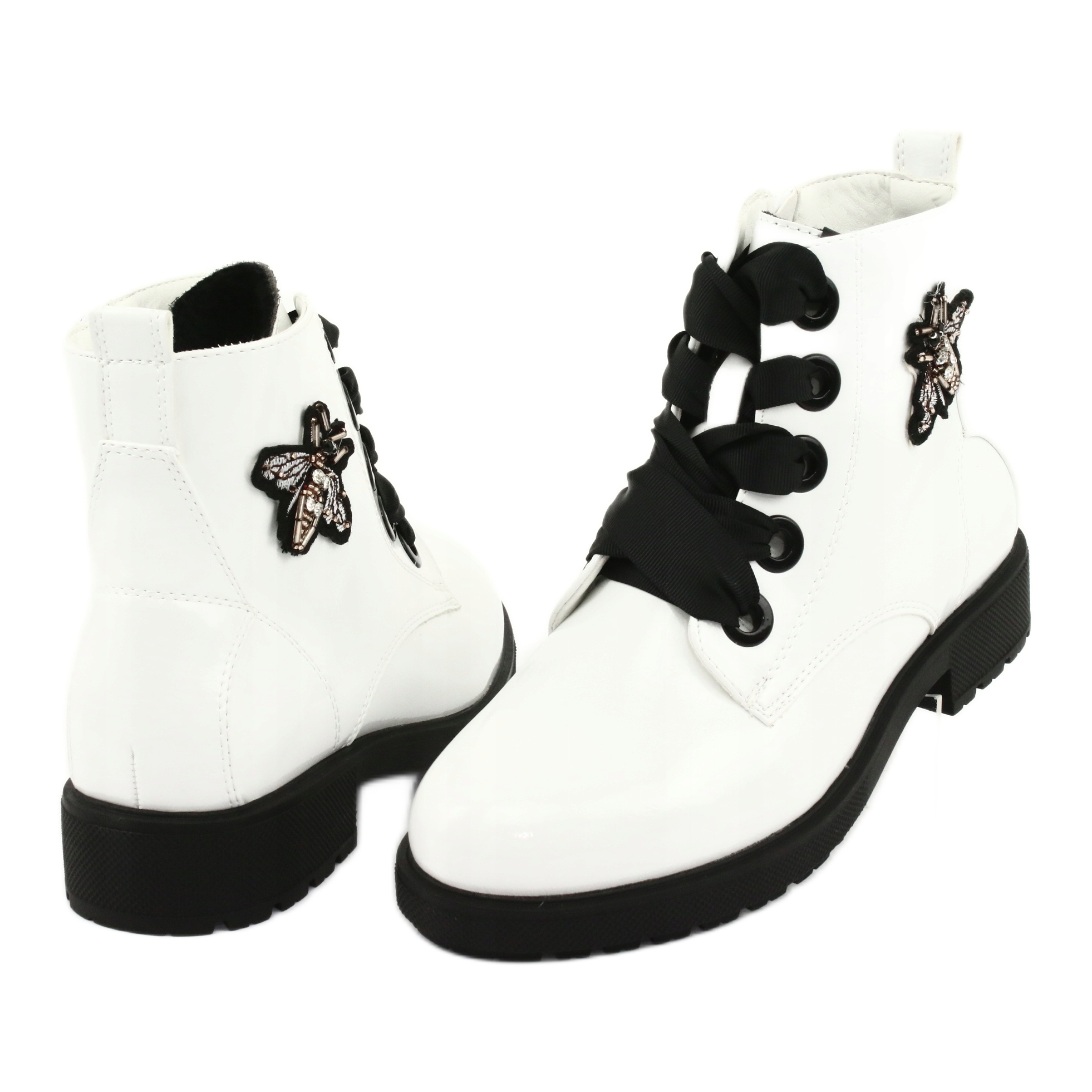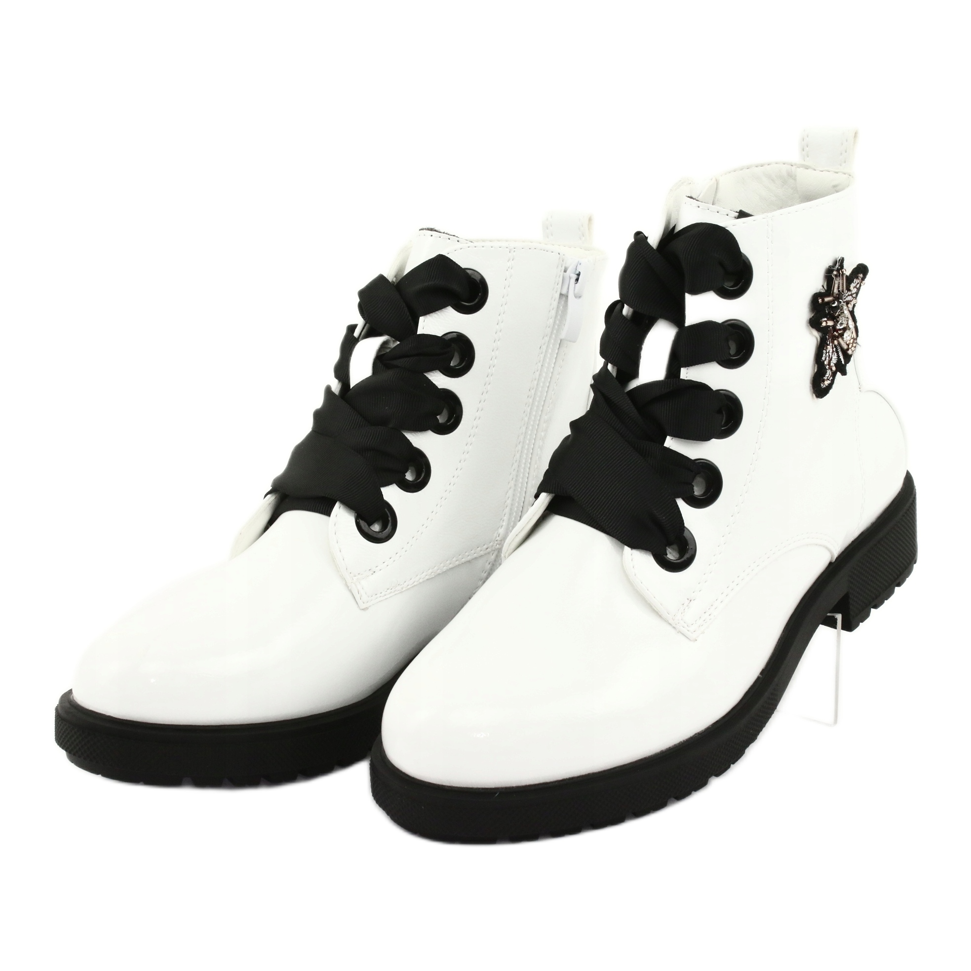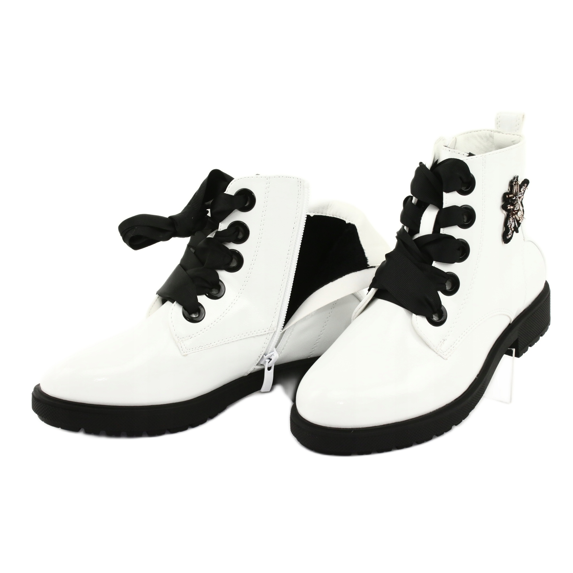 Les bottes laquées "Mucha" Sergio Leone 530 en blanc et noir sont un excellent choix pour les femmes qui apprécient le style et le confort. Fabriqués en cuir verni écologique de haute qualité, ils séduisent non seulement par leur esthétique, mais aussi par leur fonctionnalité. Grâce aux détails tendance sous la forme d'un nœud papillon élégant et de strass subtils, chaque pas de ces bottes attire l'attention.