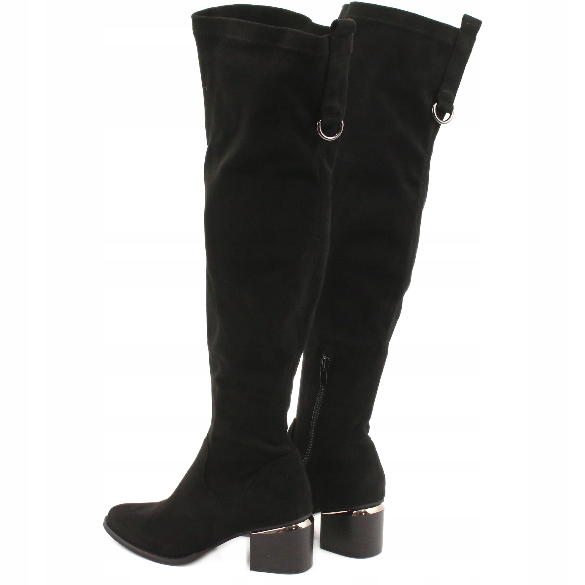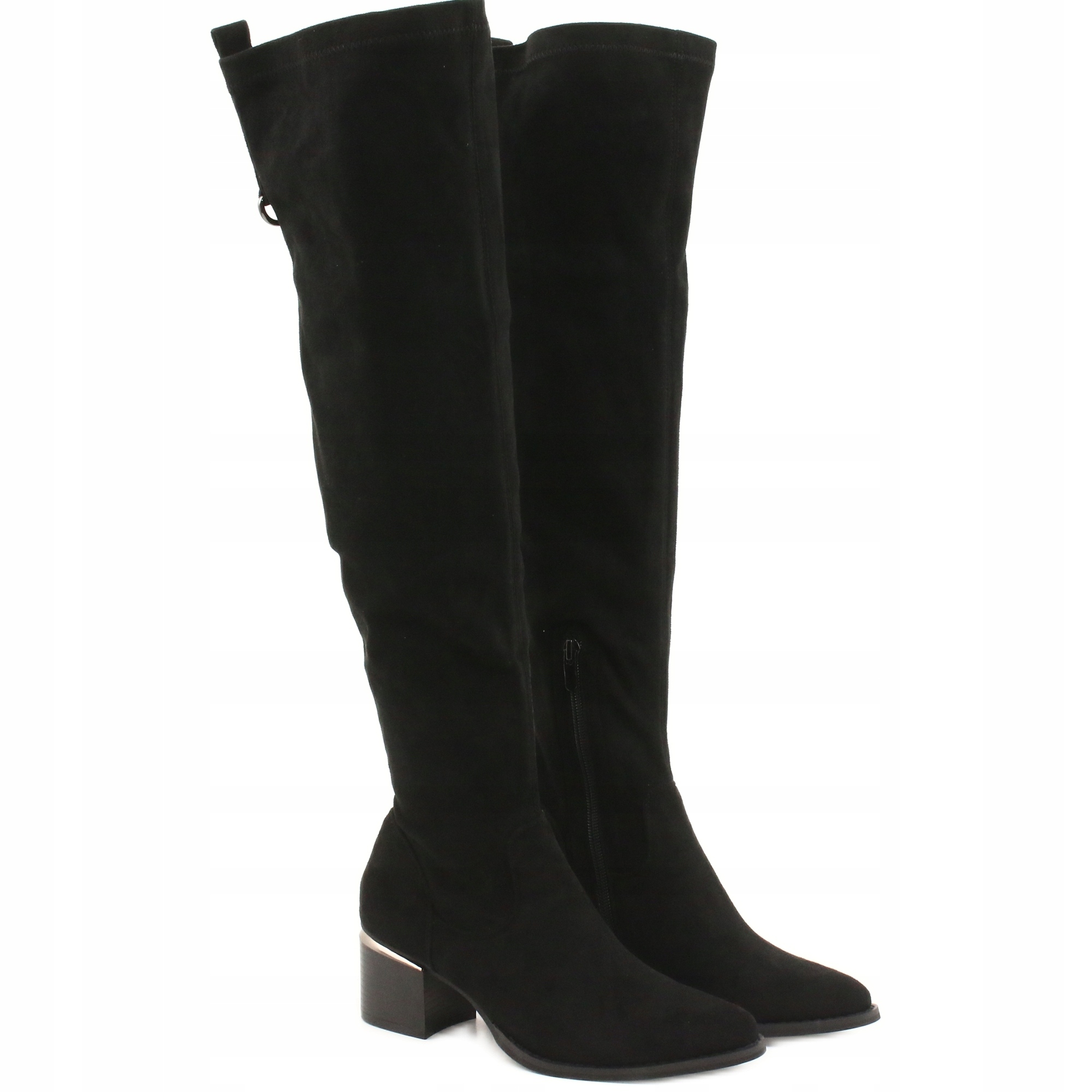 Des mousquetaires élégants en daim élastique en daim élastique, qui s'adaptent parfaitement à la jambe. Le modèle est équipé d'une serrure pratique qui facilite l'installation et le glissement confortable. La partie inférieure de la tige est isolée avec une fourrure douce, qui assure le confort thermique à des températures plus basses. Une couleur noire classique avec des détails dorés et un orteil d'amande ajoutent un personnage élégant aux chaussures - parfait pour les jupes et les robes et les pantalons.