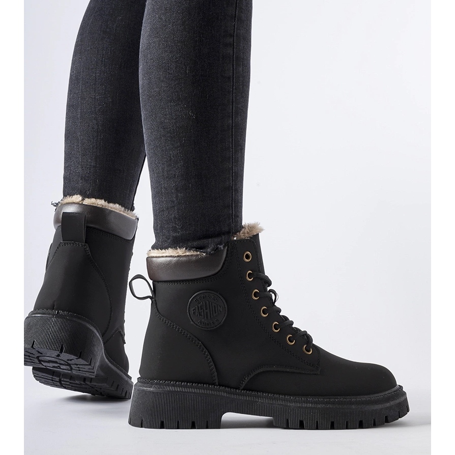 Les trapeurs Medole élégants et intemporels sont la combinaison parfaite de conception urbaine et de solutions pratiques pour les mois froids. Haut, atteignant la cheville, en cuir écologique, avec une fourrure douce à l'intérieur, offrent de la chaleur et du confort tout au long de la journée. Une semelle en caoutchouc solide garantit une bonne adhérence sur la neige et les surfaces glacées, et le laçage vous permet d'adapter la chaussure au pied. Un nez rond donne la liberté à vos doigts, vous pouvez donc marcher pendant des heures sans vous sentir fatigué.