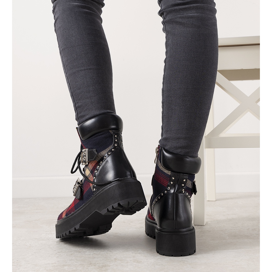 La tige des bottines est ornée d'un charmant motif à carreaux dans des tons harmonieux de rouge, bleu marine et beige, qui leur confère un caractère original. Grâce au laçage réglable et aux sangles décoratives, vous pouvez ajuster leur ajustement à vos besoins, et la fermeture éclair les rend faciles à enfiler et à enlever.