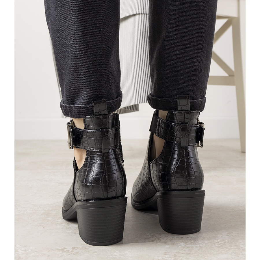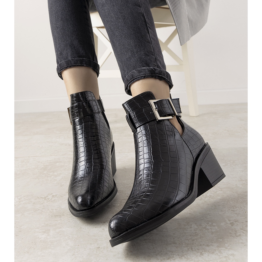 Les bottines noires à talons hauts avec découpes Moderniso sont le choix parfait pour les femmes qui souhaitent allier élégance et confort. Ce modèle impressionne par un motif unique imitant la peau de crocodile, ce qui lui donne du caractère et un style unique. Grâce au slip-on pratique et à la bride réglable autour de la cheville, l'ajustement au pied est extrêmement confortable.