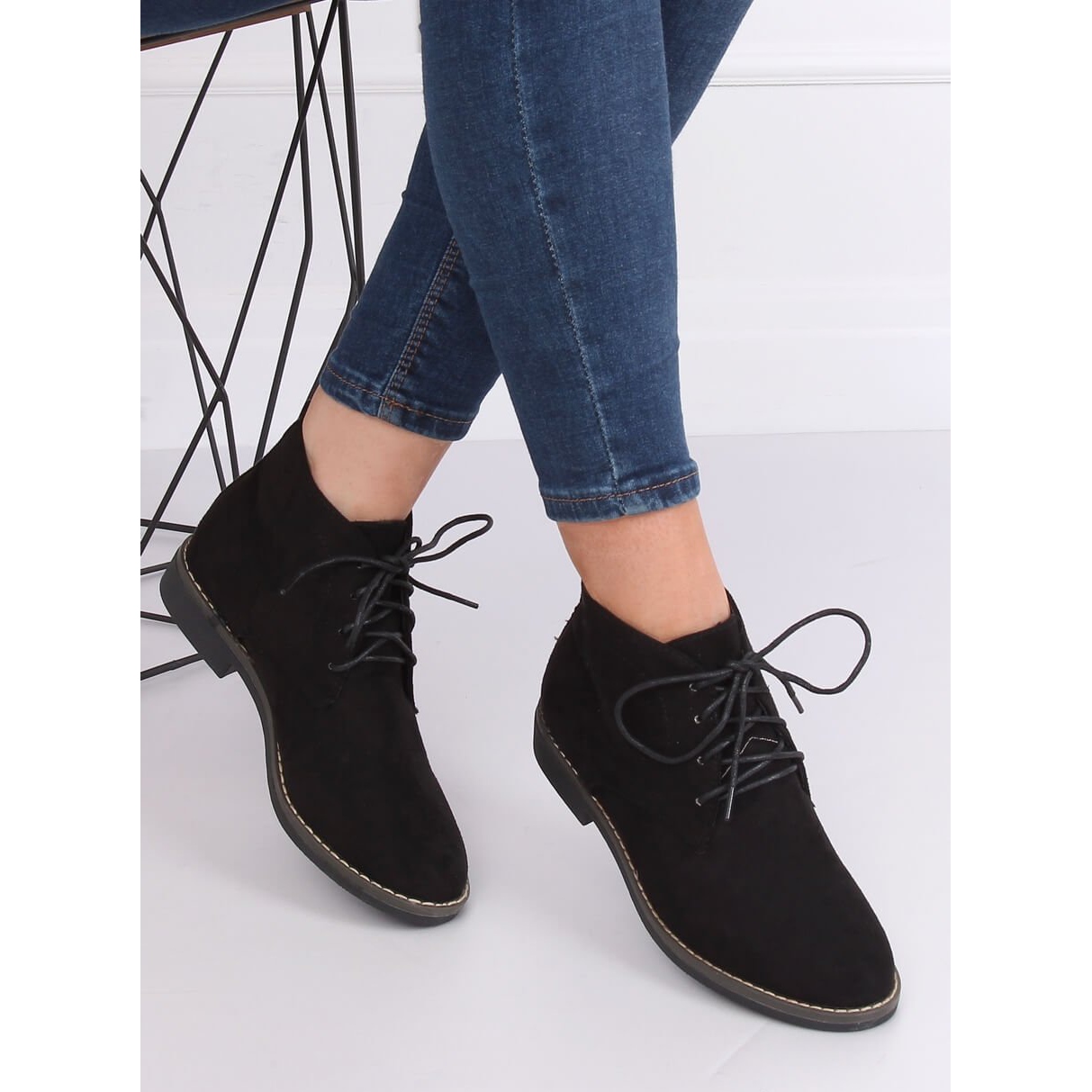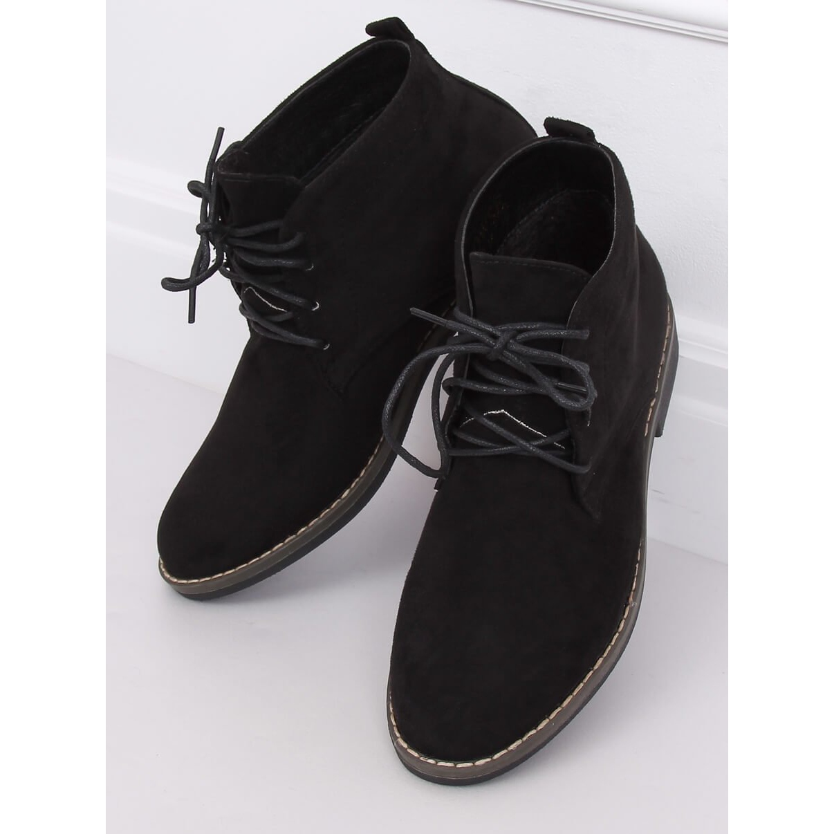 Noir 8B977 Les bottines à lacets noires sont un choix idéal pour les femmes qui apprécient le style et le confort au quotidien. Fabriquées en daim écologique de haute qualité, ces bottines élégantes allient design moderne et praticité. Le laçage classique permet aux chaussures de s'adapter parfaitement au pied, assurant leur stabilité et leur confort de port.