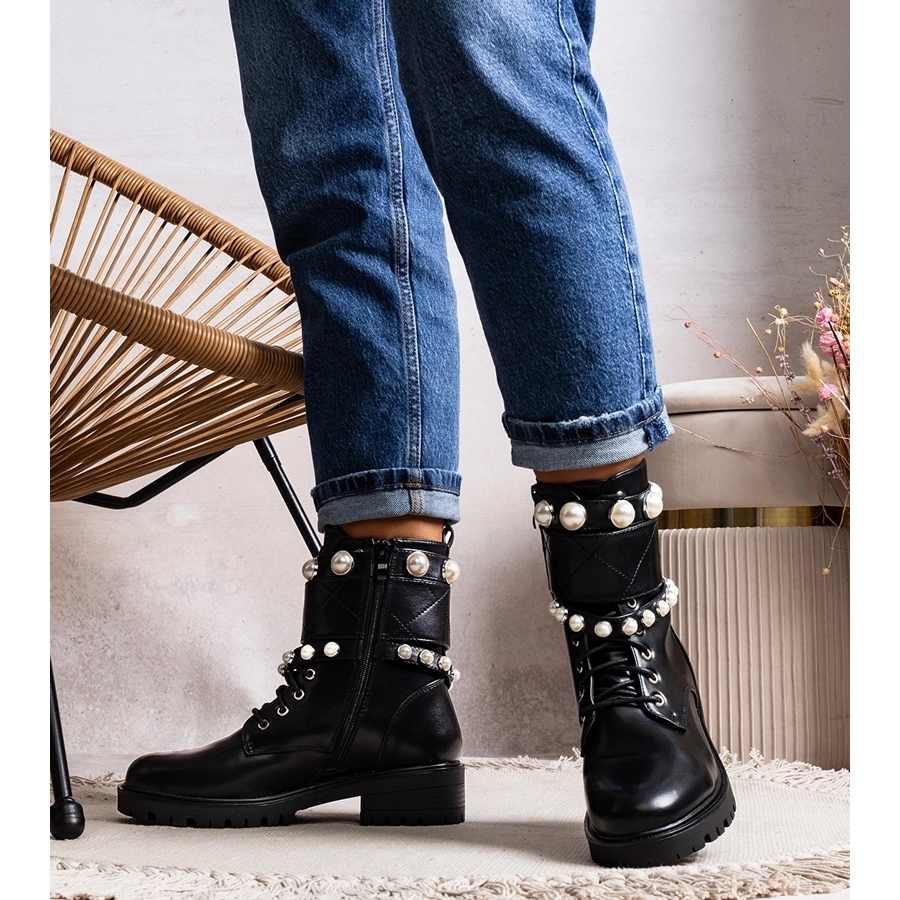Découvrez des bottines noires uniques avec des perles qui donneront à votre style un caractère unique ! Ces élégantes baskets allient style et confort, grâce à une tige soigneusement travaillée et ornée de brides ornées de perles, qui leur confèrent une allure extrêmement féminine. Fabriquées en cuir écologique de haute qualité, les bottes sont non seulement élégantes, mais aussi durables.