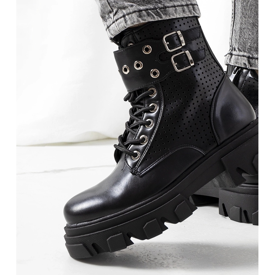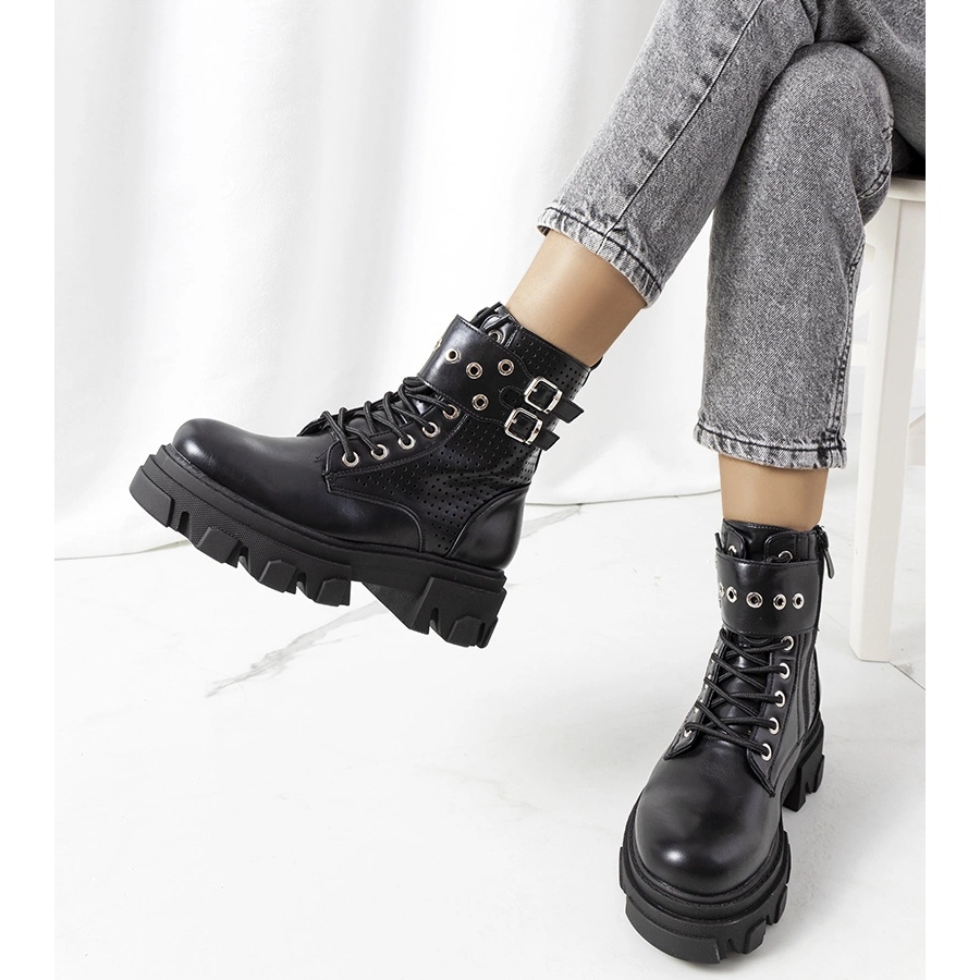 Des bottes Black Rubeo sur une semelle de trappeur - parfaite lorsque vous voulez ajouter un style de griffe. Une semelle solide et tracteur leur donne un personnage brut, et les finitions et les jets ouverts ajoutent du style de roche. Le haut en cuir écologique en haute qualité assure une apparence esthétique et une durabilité, tandis que l'insert du cuir écologique garantit également le confort.