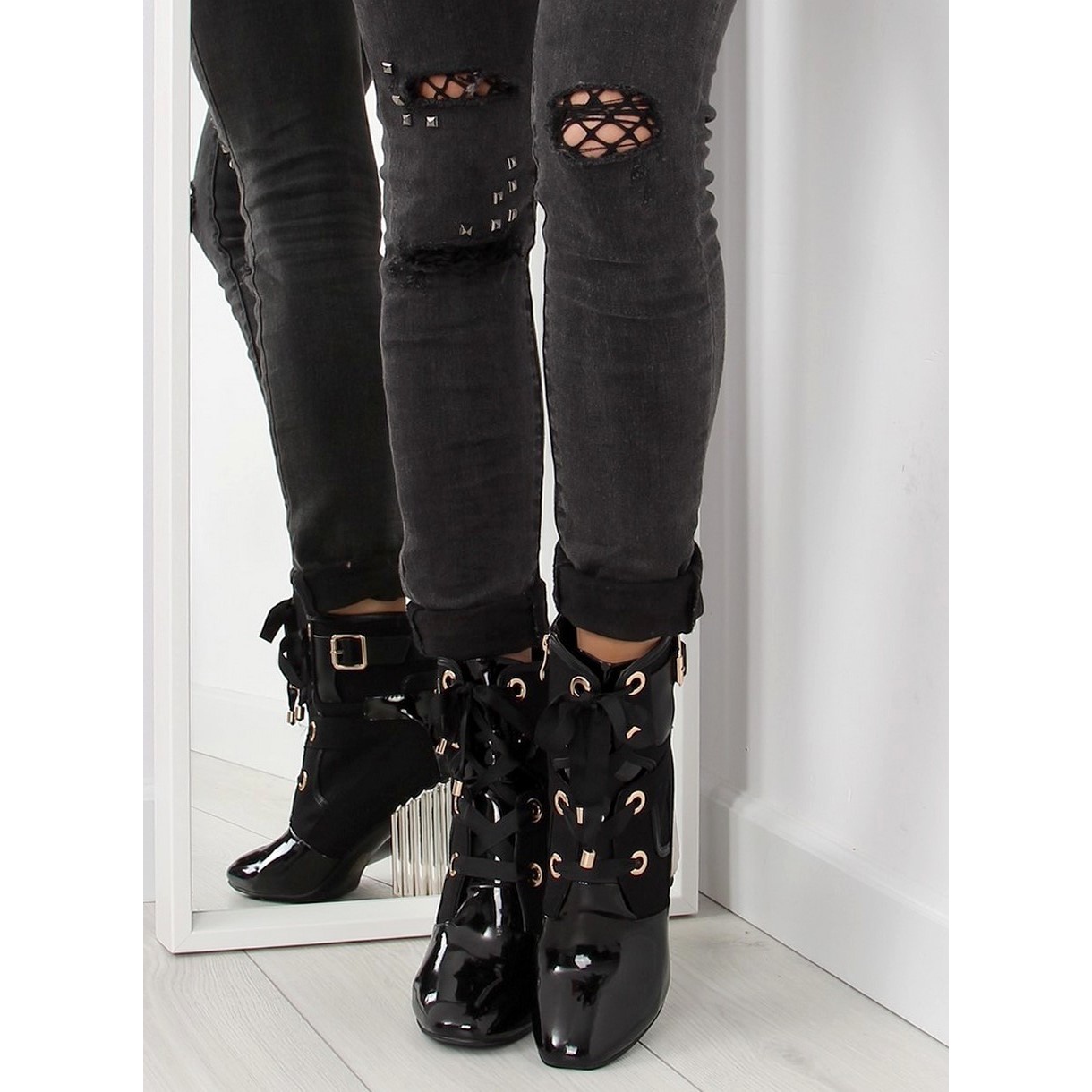 Fabriquées en similicuir verni et en tissu à texture toile, ces bottes sont vraiment impressionnantes. Le talon original de 10 cm ajoute de la classe et vous permet de vous sentir en confiance dans toutes les situations. Le design à lacets a été enrichi d'une fermeture éclair pratique, ce qui rend l'enfilage un pur plaisir.