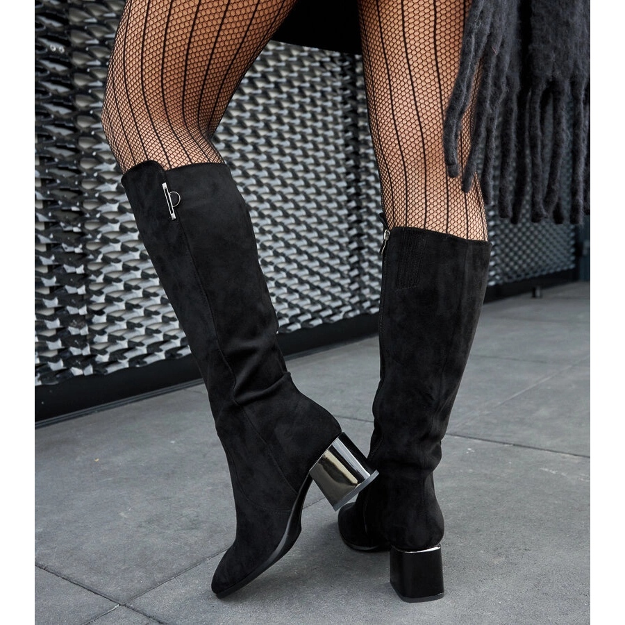 Ce produit est des bottes noires à talons mi-hauts pour femmes avec un talon bloc, qui assurent le confort lorsqu'elles sont portées et ajoutent de la confiance en soi. Les bottes sont faciles à enfiler et à enlever grâce à la fermeture éclair latérale. Les matériaux utilisés pour leur production sont le plastique, ce qui rend les chaussures durables et résistantes aux conditions hivernales. Les bottes ont un bout carré, ce qui leur donne un caractère unique et un look tendance.