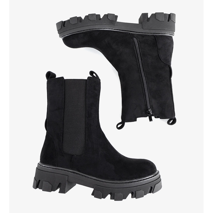 La tige en cuir écologique suédé leur donne un look luxueux et élégant, et le bout rond les rend confortables à porter même pendant de longues heures. La hauteur cheville des chaussures et la plateforme de 5 cm de hauteur les rendent à la fois confortables et allongent visuellement les jambes. Un avantage supplémentaire est l'isolation, qui assure le confort les jours les plus froids.