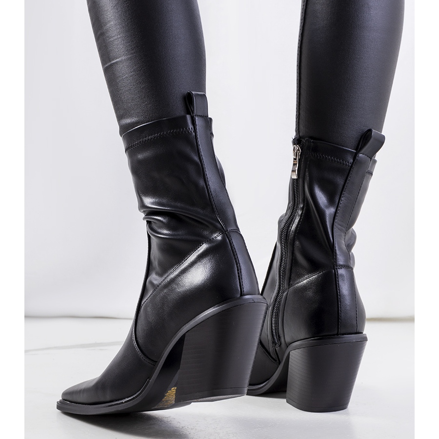 Les bottines noires à talons hauts sont un choix parfait pour tous les amoureux de la mode qui souhaitent ajouter un peu d'élégance et de modernité à leur style. Ce modèle impressionne non seulement par sa forme unique à talon bloc, mais également par son bout carré très tendance, qui revient au sommet des tendances cet automne.
