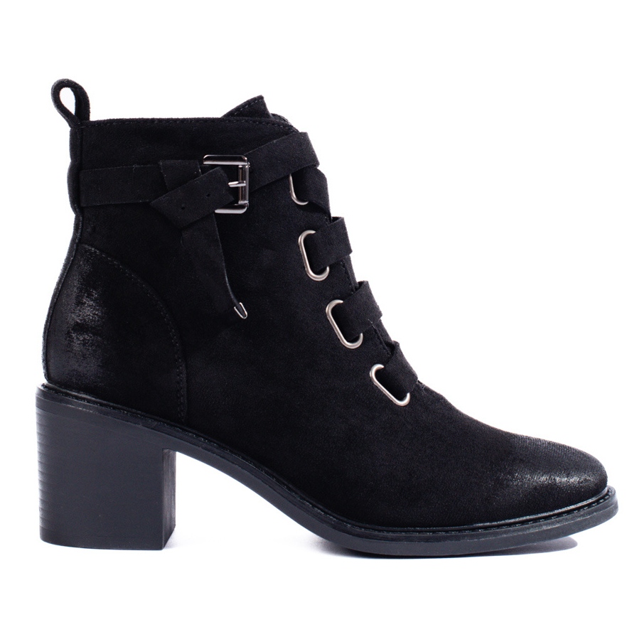 Classic, et en même temps avec des bottes-noir sur le poteau est un incontournable pour la saison d'automne / hiver. Fabriqué en daim écologique doux, avec isolation et "couverture de chaussures", ils offrent un confort thermique pendant les jours plus frais. Un poteau stable de 6 cm de haut ajoute un look féminin, sans fatiguer vos pieds.