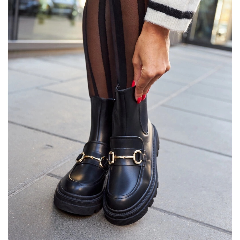 Les bottes sont hautes, se terminent juste au-dessus de la cheville et ont une plateforme de 4 cm, ce qui leur permet d'allonger optiquement la jambe et d'ajouter de la confiance en soi. Elles sont entièrement réalisées en cuir écologique noir, avec un bout rond et une semelle en caoutchouc noir avec un protecteur visible.