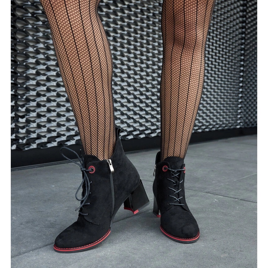 Les bottines noires avec un accent rouge sur le talon sont des chaussures pour femmes élégantes et fonctionnelles, conçues pour un usage quotidien. Fabriqués en cuir suédé écologique, ils sont de haute qualité et résistants aux dommages. Leur design unique les rend parfaitement assortis à différents styles, à la fois décontractés et plus formels.