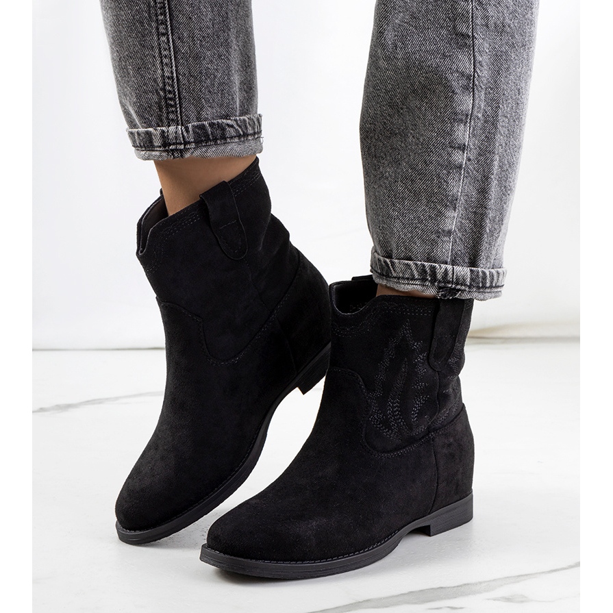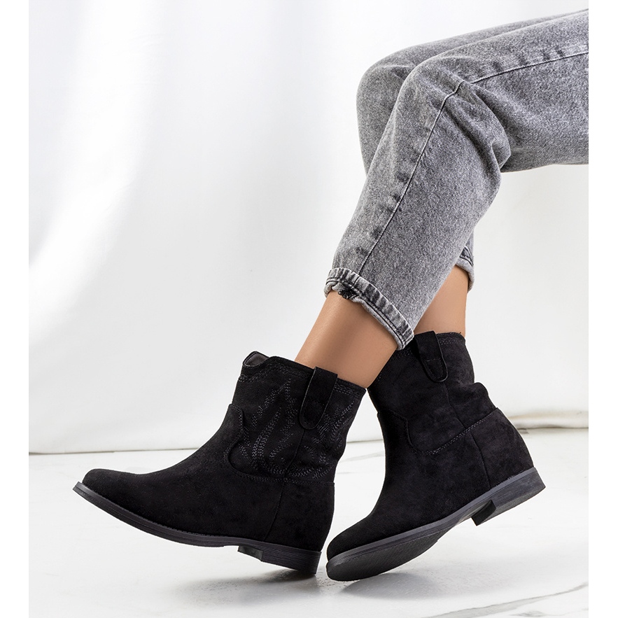 Les bottines noires Wolfpine avec une semelle compensée intérieure sont le choix parfait pour les femmes qui apprécient les chaussures élégantes et confortables. Inspirées du style cowboy, ces bottes allient élégance et praticité. Fabriquées en éco-daim, elles se caractérisent par des coutures sur l'extérieur de la tige, ce qui leur confère un caractère unique.