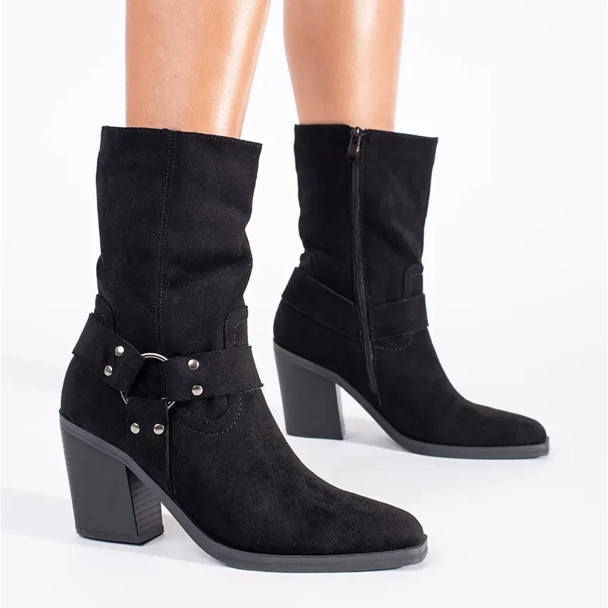 Le modèle de bottines à talons hauts en daim noir se distingue par un design classique et minimaliste, sans motifs, ce qui en fait un complément polyvalent à de nombreux styles, aussi bien au quotidien que pour des occasions spéciales. Une tige haute à hauteur de cheville (hauteur 19 cm) et un bout rond assurent non seulement un look élégant, mais aussi un confort de port.