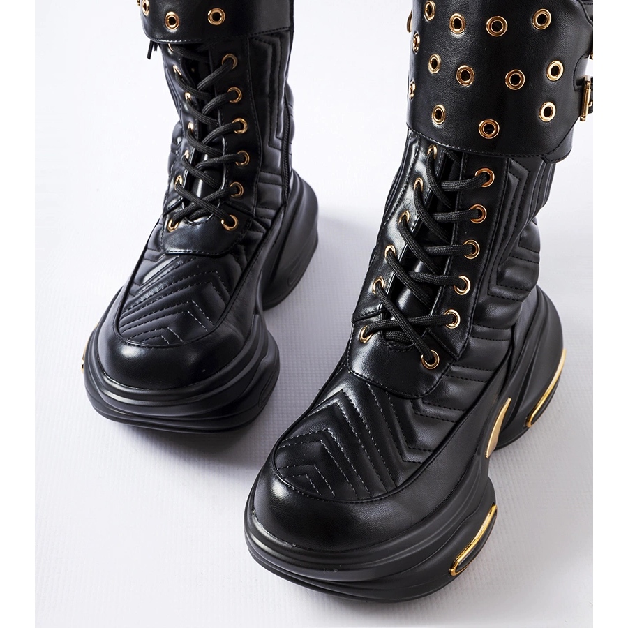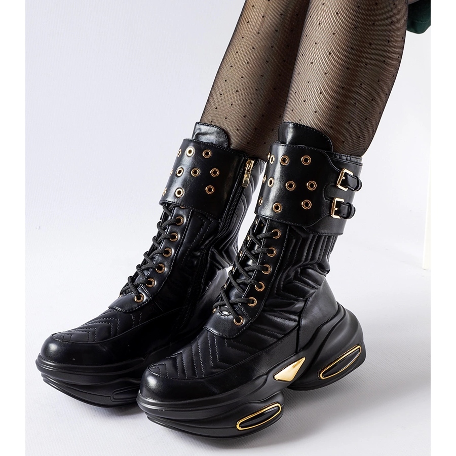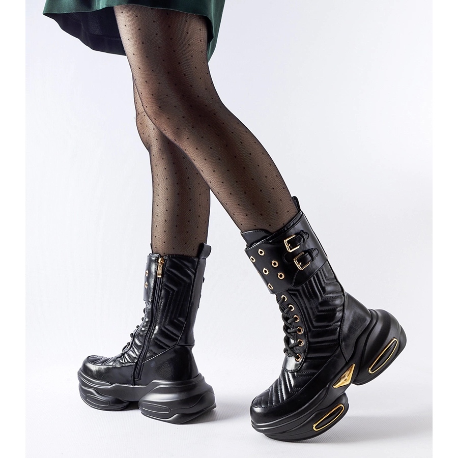 Les bottines noires ornées de matelassage sont un choix hivernal élégant et fonctionnel pour chaque femme. Elles sont confectionnées en cuir écologique de haute qualité et présentent des bouts ronds élégants. Les chaussures ont un talon moyen, ce qui garantit une apparence attrayante et un confort de port. Elles sont faciles à enfiler grâce au laçage et à la fermeture éclair, ce qui permet également de bien les ajuster au pied. Les bottines sont dédiées aux femmes à la recherche de chaussures d'hiver stylées.