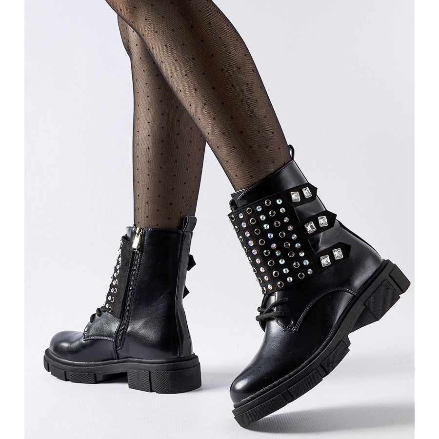 Les bottines noires ornées de zircons cubiques sont des chaussures pour femmes qui s'inscrivent parfaitement dans les tendances de la mode contemporaine. Elles sont fabriquées en cuir écologique de haute qualité et la semelle des chaussures est en caoutchouc. Leur principal avantage réside dans les strass et les strass, qui leur confèrent élégance et caractère exclusif. Les bottes ont un bout rond et un talon plat de 4 cm de haut, ce qui augmente encore le confort de port.