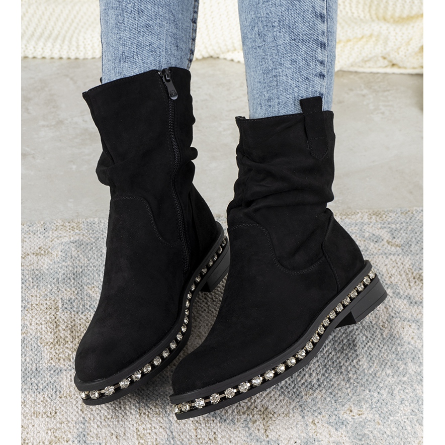 Découvrez l'élégance et le style unique avec les bottines Voleta noires, qui s'adaptent parfaitement aux dernières tendances de la mode. Ces bottines classiques en cuir suédé écologique séduisent non seulement par leur apparence, mais aussi par leurs détails accrocheurs. Des rides délicates sur la tige ajoutent du caractère, et des strass brillants autour de la semelle donnent à l'ensemble un éclat unique.