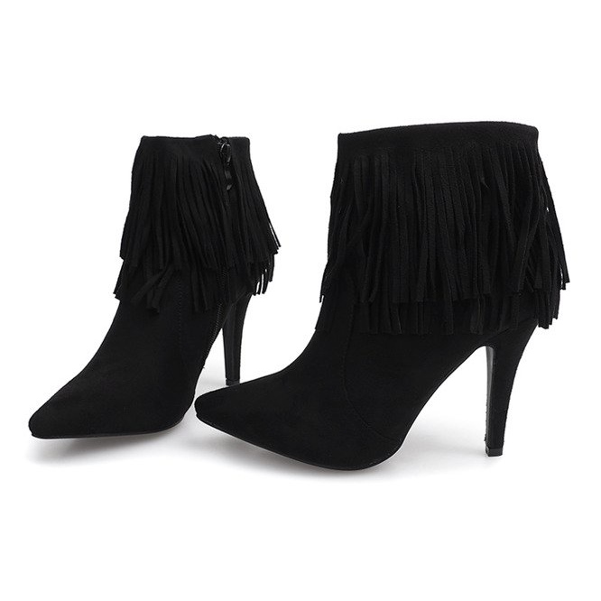 Une semelle synthétique de haute qualité assure le confort au porté, et le bout en amande ajoute un charme subtil à l'ensemble. Les bottes mesurent 21 cm de haut et sont stables grâce à un talon de 10 cm de haut, ce qui leur permet d'allonger optiquement les jambes. De plus, des franges intéressantes sur la tige introduisent un peu de style bohème, faisant de ces bottes un choix idéal pour les occasions spéciales, les fêtes ou les soirées.