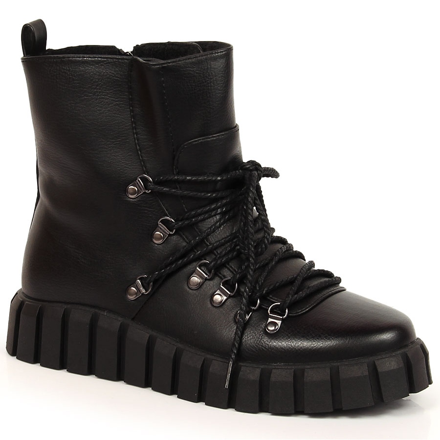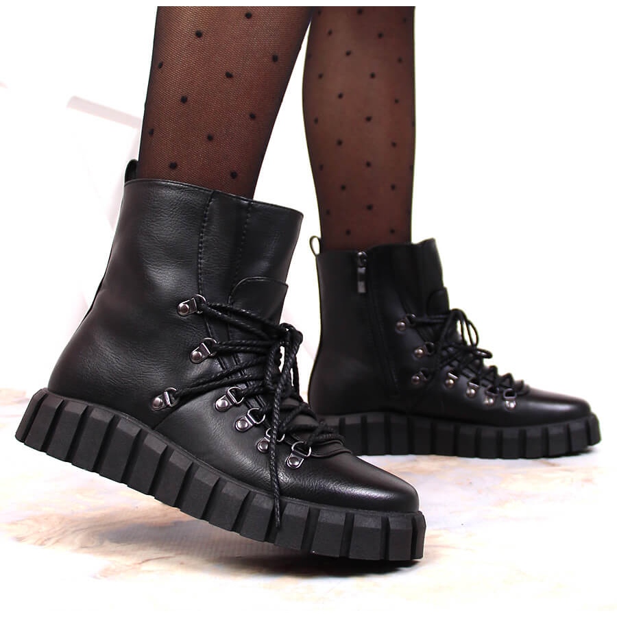 Le design des chaussures combine un design décontracté avec des caractéristiques pratiques, créant un produit aussi bien pour un usage quotidien que pour des occasions spéciales. Les bottes noires expressives sont fabriquées en cuir écologique de haute qualité et complétées par une semelle plus épaisse. Des détails subtils comme une fermeture éclair et un laçage facilitent l'ajustement de la chaussure au pied et assurent un confort d'utilisation.