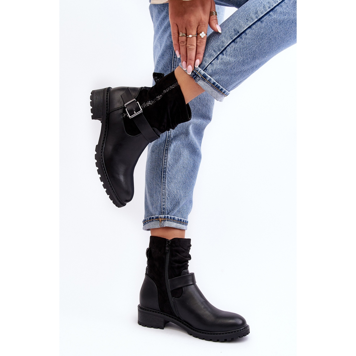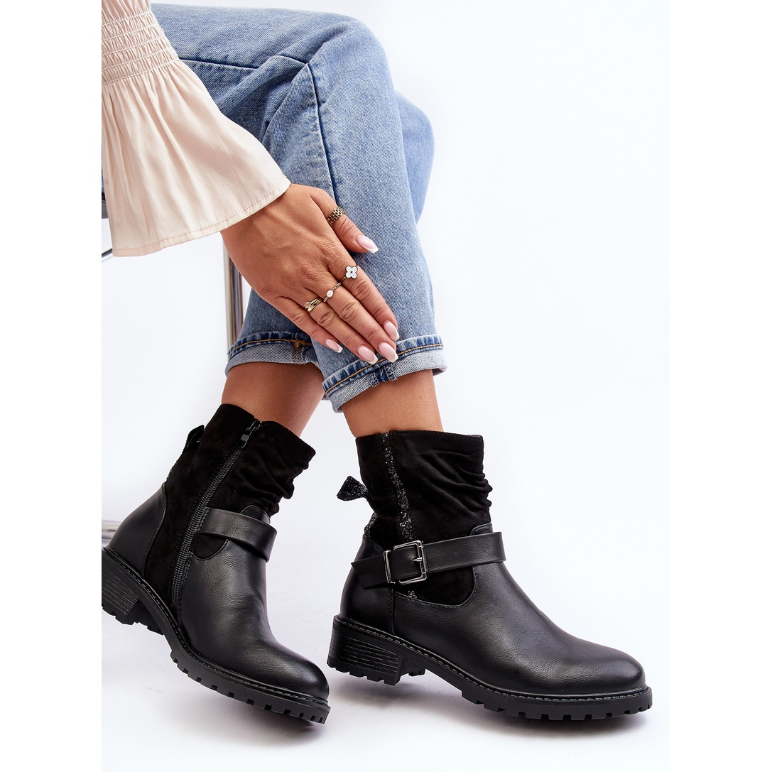 Les bottines noires pour femmes sont un ajout élégant à votre garde-robe automne-hiver. Ils sont constitués d'une combinaison de cuir écologique et de daim écologique, ce qui garantit durabilité et confort de port. La tige de la botte dépasse la cheville et est froncée. Les bottines sont ornées de petits sequins et d'une ceinture avec boucle. Les bouts des chaussures sont arrondis et le talon est rigidifié. Ils sont fermés par une fermeture éclair, ce qui les rend faciles à mettre et à enlever. Les bottes sont isolées avec de la fourrure synthétique, ce qui les rend parfaites pour les journées plus froides. Le talon plat et stable mesure 4 cm de haut, ce qui assure un confort même en cas de port prolongé. La semelle est en plastique, la semelle intérieure est en tissu et la doublure intérieure est en fourrure. Le produit est disponible en différentes tailles. L'emballage comprend la boîte d'origine du fabricant. Le motif du chausson est lisse, sans motifs supplémentaires. Le poids du produit avec emballage individuel est de 1,2 kg.