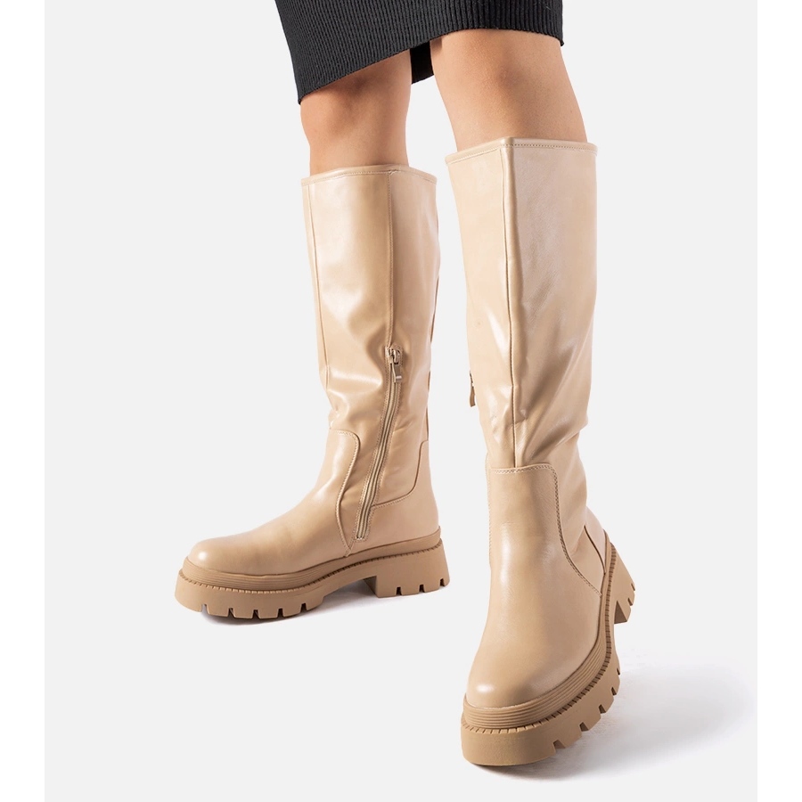 Ces chaussures sont confectionnées en cuir écologique de teinte beige, avec le code couleur du fabricant « Beige ». Elles mesurent 43 cm de hauteur, du bas de la semelle jusqu'au bord supérieur de la tige, ce qui signifie qu'elles arrivent jusqu'aux genoux. Le talon mesure 4 cm de haut. La largeur de la tige est de 20,5 cm. Les chaussures sont livrées dans l'emballage d'origine du fabricant.