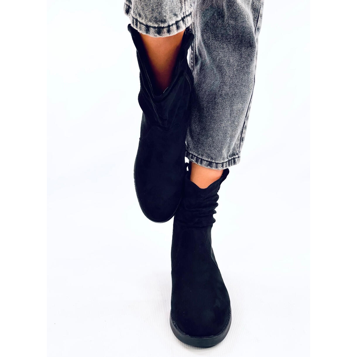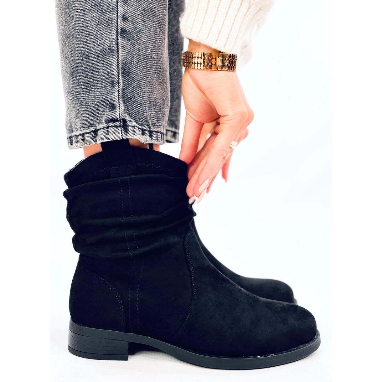 Nous présentons des bottines plates classiques dans une élégante couleur noire, qui s'intègrent parfaitement au style de tous les jours. Ces bottines pour femme en daim à semelle plate se caractérisent par une tige à volants tendance, qui leur ajoute un charme unique, brisant le design minimaliste.