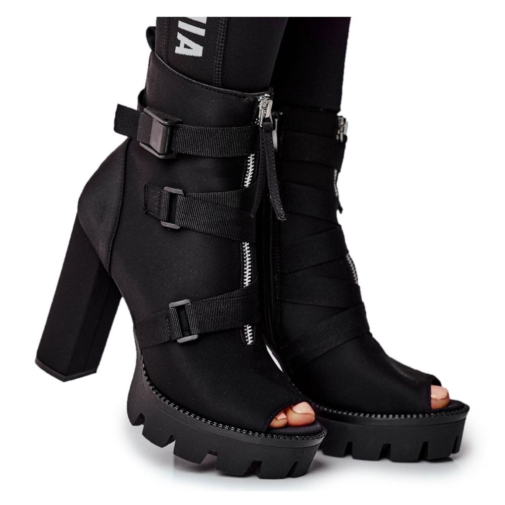 Découvrez l'élégance et le style avec les bottes à bout ouvert exclusives pour femmes PS1 ! Ce modèle, disponible dans un coloris noir intemporel, est une combinaison parfaite entre design classique et moderne. Fabriquées en cuir écologique de haute qualité, elles se caractérisent par des rayures entrelacées sur la tige, qui leur confèrent un caractère unique et font de chaque pas une déclaration de mode.