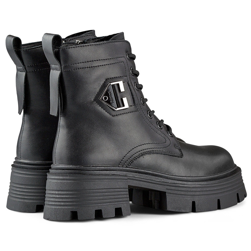 Des bottes noires brutes et classiques avec un nez arrondi font partie des dernières tendances de la mode et restent en même temps extrêmement polyvalentes, assortissant de nombreux styles. La hauteur de la tige de 15 cm et une plate-forme de 6 cm de haut ajoute une certitude à chaque étape et allongent subtilement les jambes. La caste de fermeture éclair et le laçage supplémentaire font que les bottes s'adaptent parfaitement au pied, et vous gagnez la pleine liberté de mouvement.