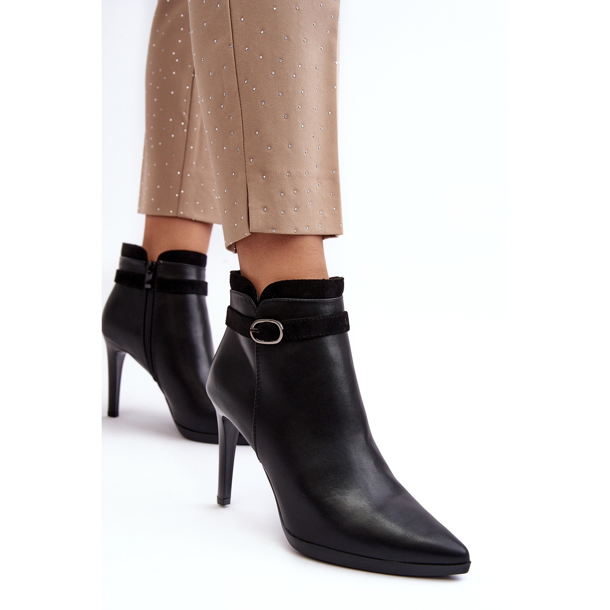 Leur fixation sur un talon aiguille de 10 cm de haut ajoute non seulement un caractère sophistiqué, mais allonge également optiquement les jambes grâce aux bouts pointus. La tige ornée d'une fine bride avec une boucle rend ces bottes non seulement à la mode, mais aussi pleines d'originalité.