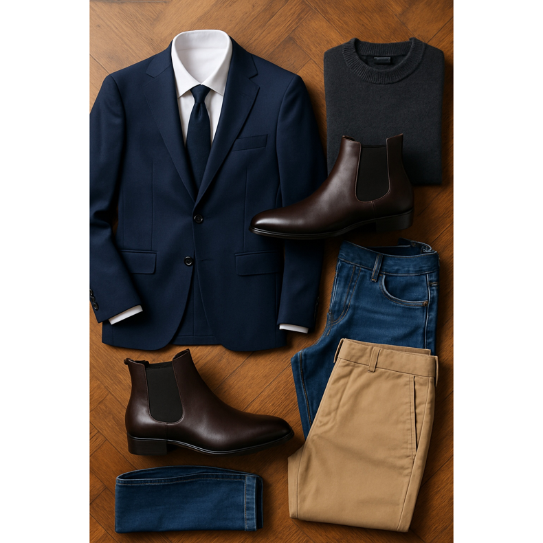 Les bottines Chelsea noires ou marron foncé s'accordent parfaitement avec les costumes dans les tons bleu marine, gris et noir. C'est une alternative élégante aux Oxford classiques pendant les mois les plus froids. Évitez les modèles massifs - choisissez Chelsea mince et minimaliste.
