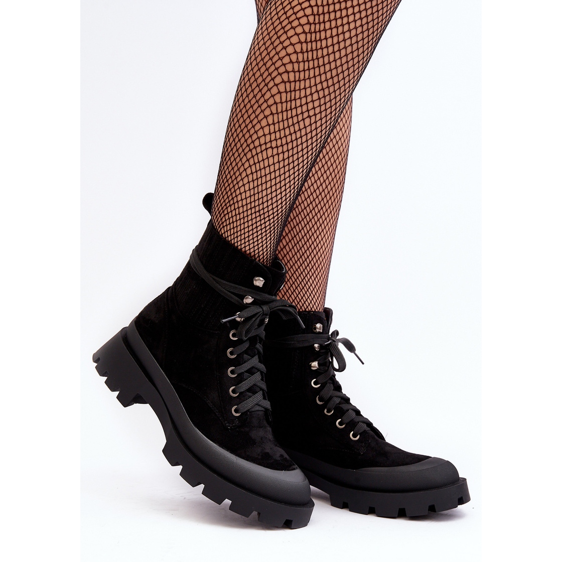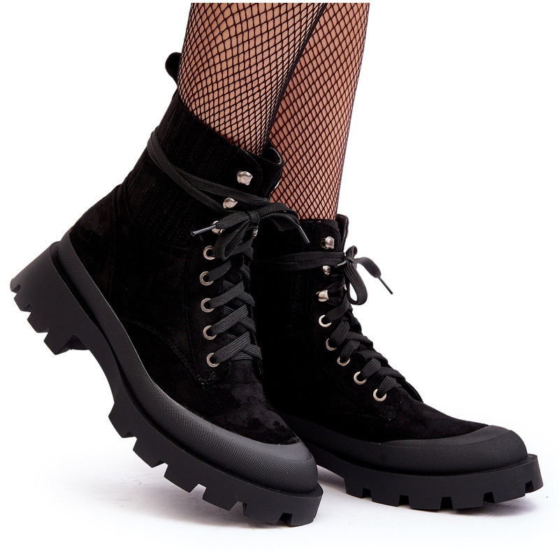 Les Trappers à lacets pour femmes noires sont des chaussures à la fois élégantes et fonctionnelles pour femmes, parfaites pour la saison d'automne et d'hiver. Ils sont fabriqués en daim écologique, ce qui garantit durabilité et confort de port. Elles se caractérisent par un modèle classique à lacets, bout arrondi et tige à la cheville.