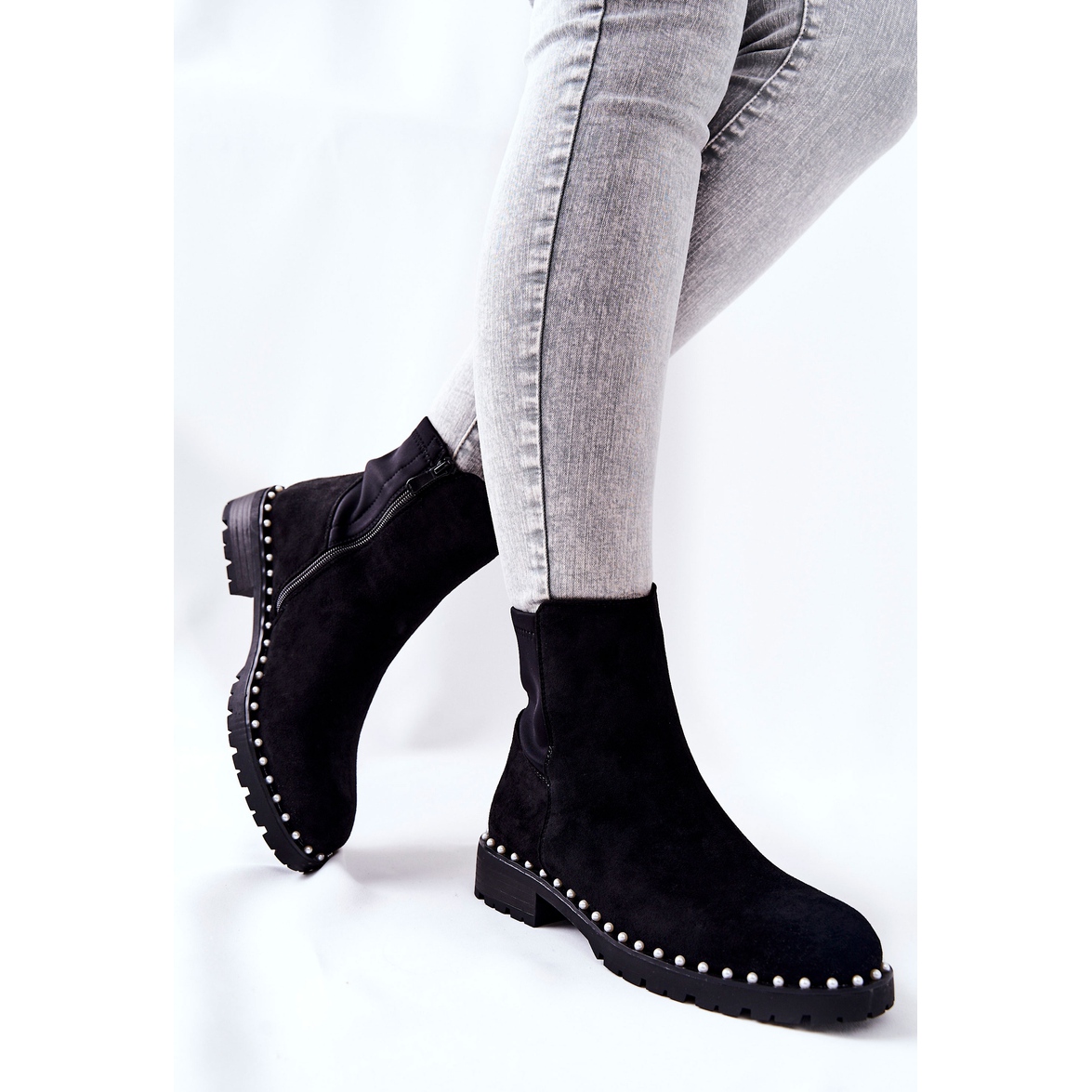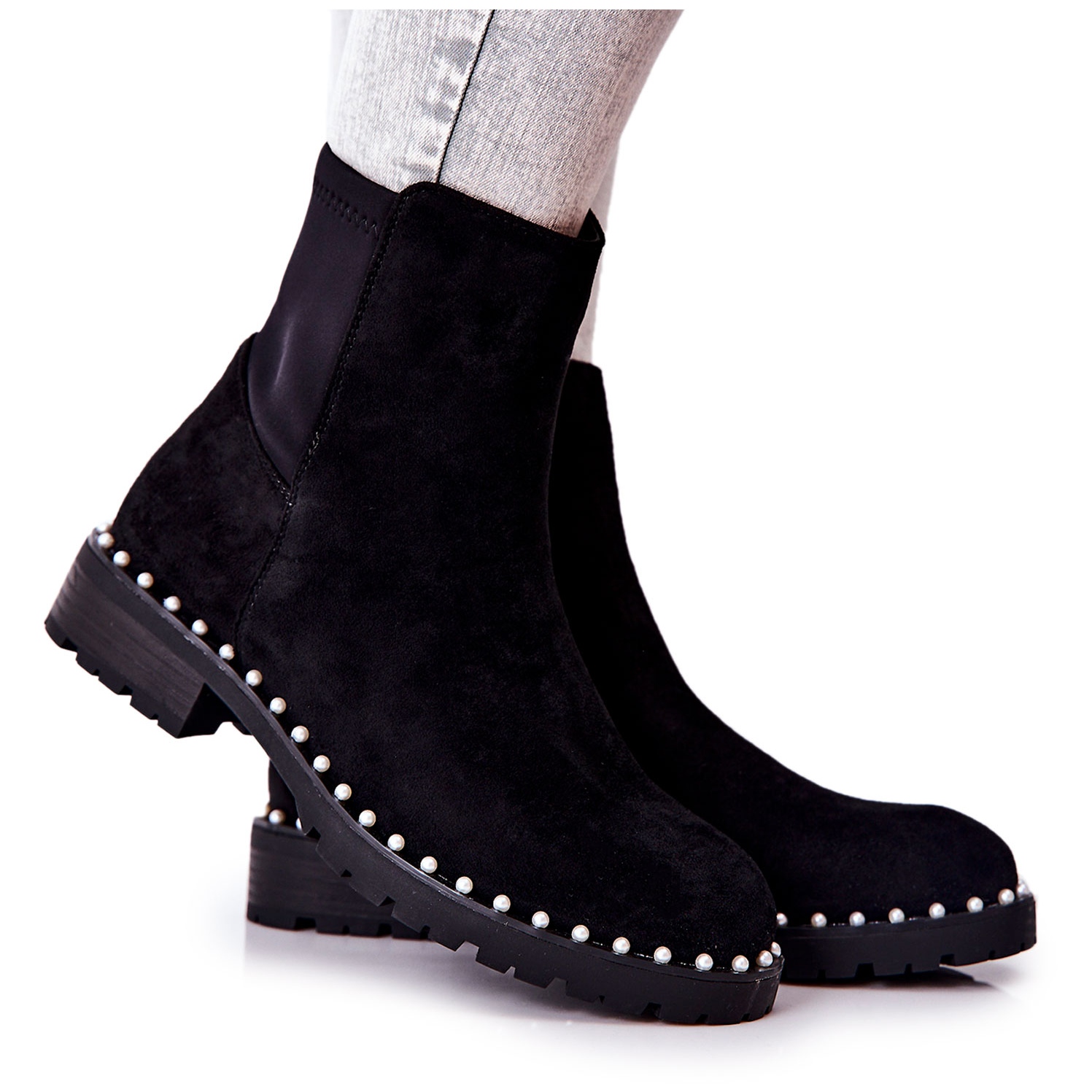 Découvrez l'élégance et le confort des bottines en daim avec perles de la marque Venie. Ces belles bottes noires en éco-daim attirent l'attention par leur finition unique - de charmantes perles décorant la semelle leur confèrent un caractère unique et un éclat subtil.