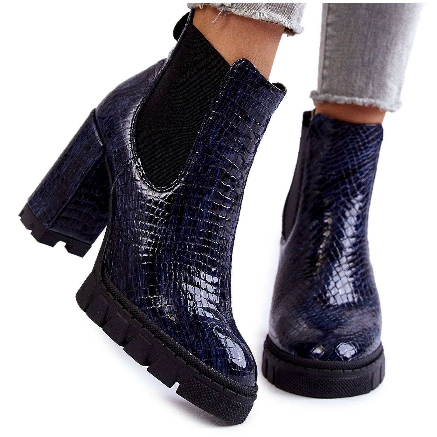 Détails: Bottines vernies à motif serpent sur talon haut, bleu marine