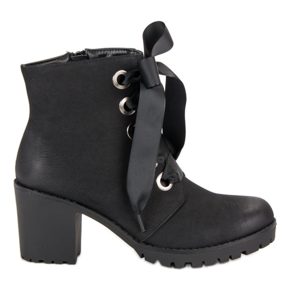 Les bottes sont fermées par une fermeture éclair et disposent d'un laçage, ce qui les rend plus faciles à enfiler et à ajuster. La hauteur du talon de 7,5 cm offre une légère augmentation, qui affine optiquement la silhouette, tout en assurant stabilité et confort au porté.