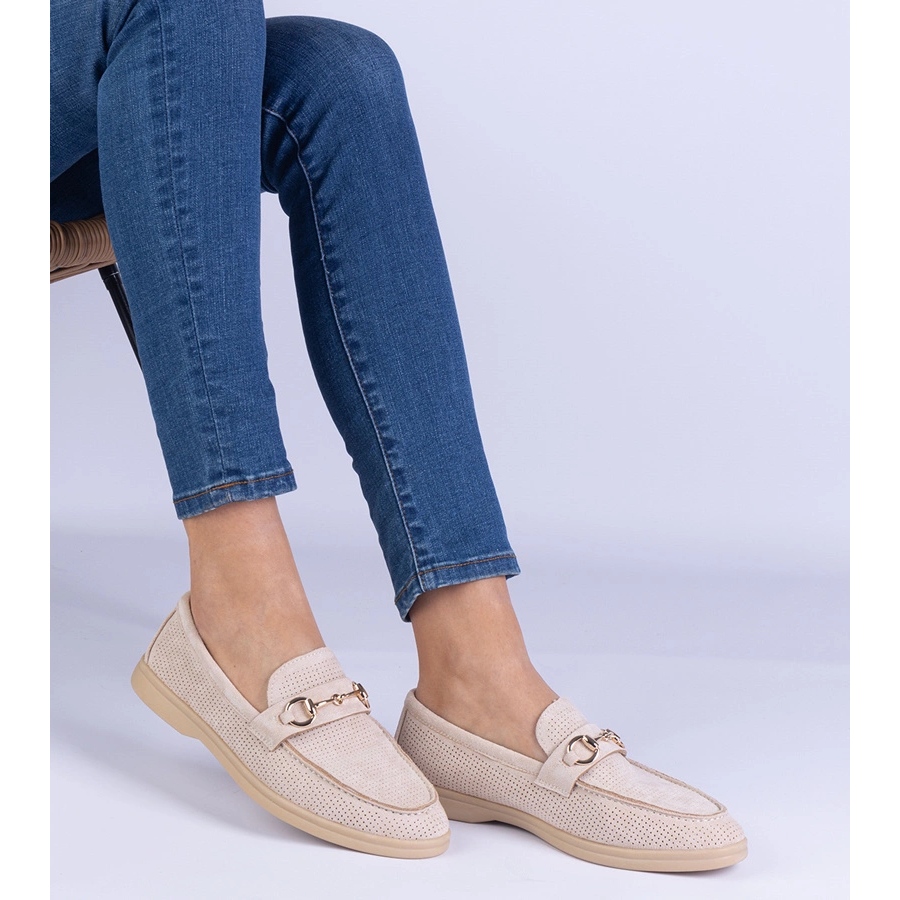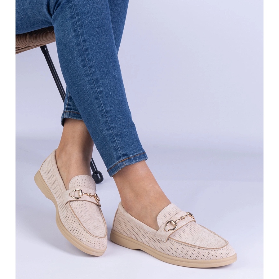 Les mocassins d'écosam beige et ouverts avec une décoration dorée sont un incontournable dans chaque garde-robe féminine. Créés pour l'élégance et le confort, ces chaussures basses de la marque d'autres marques combinent le style classique et les solutions modernes.