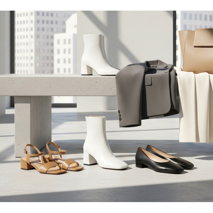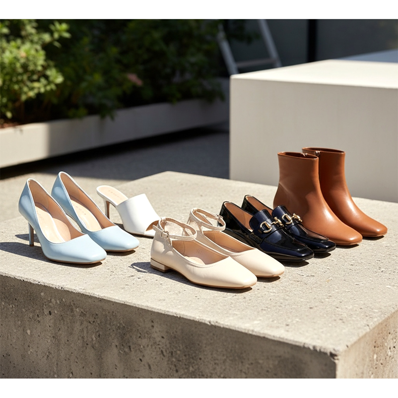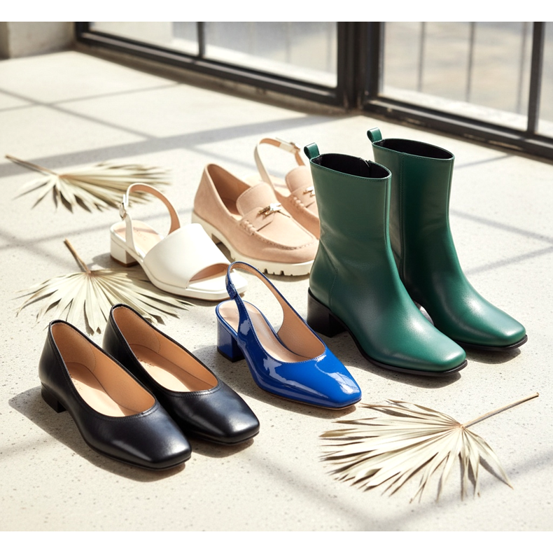 Le bout carré est devenu présent dans pratiquement toutes les catégories de chaussures pour femmes en 2026. On le retrouve le plus souvent dans :