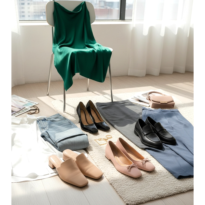 Pour le bureau, associez des ballerines ou des mocassins à bout carré avec une jupe crayon ou un pantalon cigarette. Cet ensemble est la quintessence de la power log professionnelle de 2026. Choisissez une couleur de chaussure similaire au bas de votre tenue pour allonger optiquement vos jambes.